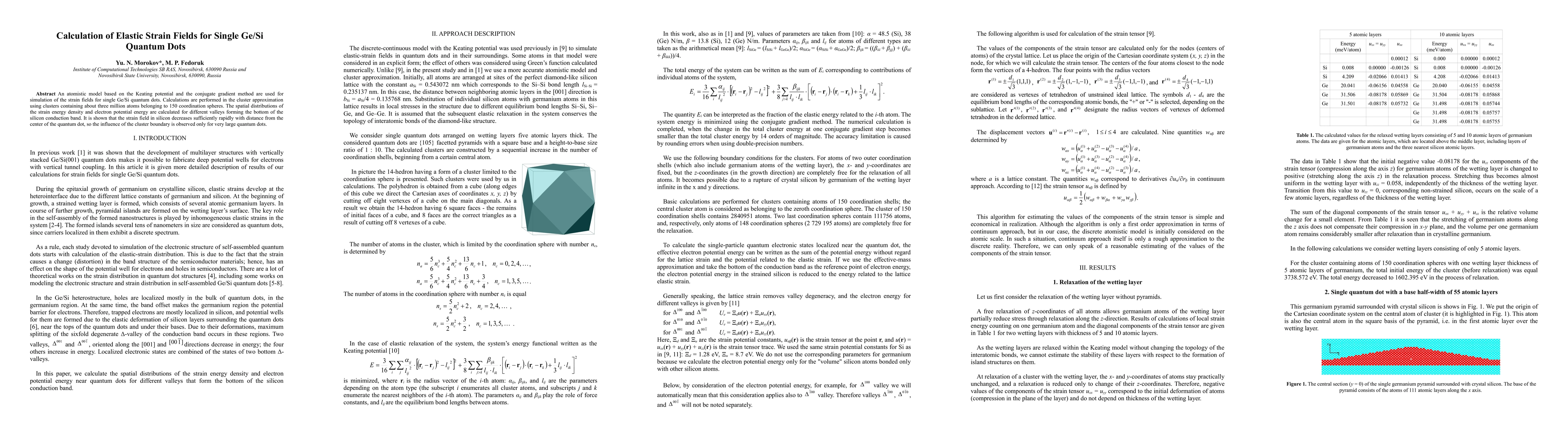 This study employs an atomistic model based on the Keating potential and conjugate gradient method to simulate strain fields in single Ge/Si quantum dots. The calculations reveal that strain fields decrease rapidly with distance from the quantum dot center, minimizing the influence of cluster boundary effects except for very large quantum dots.