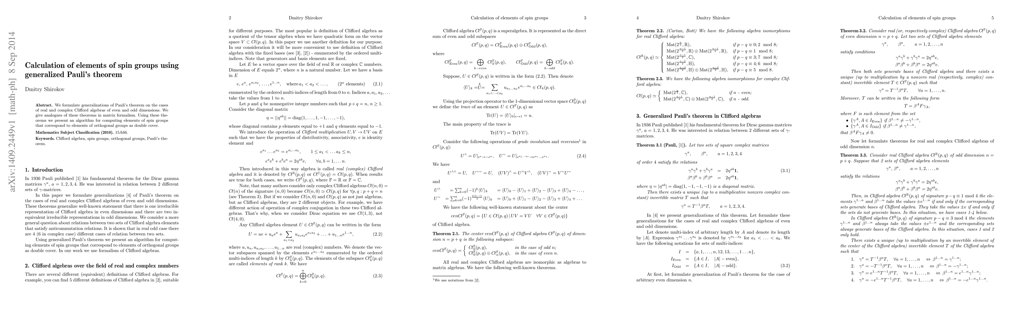 The research formulates generalizations of Pauli's theorem for real and complex Clifford algebras of even and odd dimensions, and presents an algorithm for computing elements of spin groups that correspond to elements of orthogonal groups as double cover.