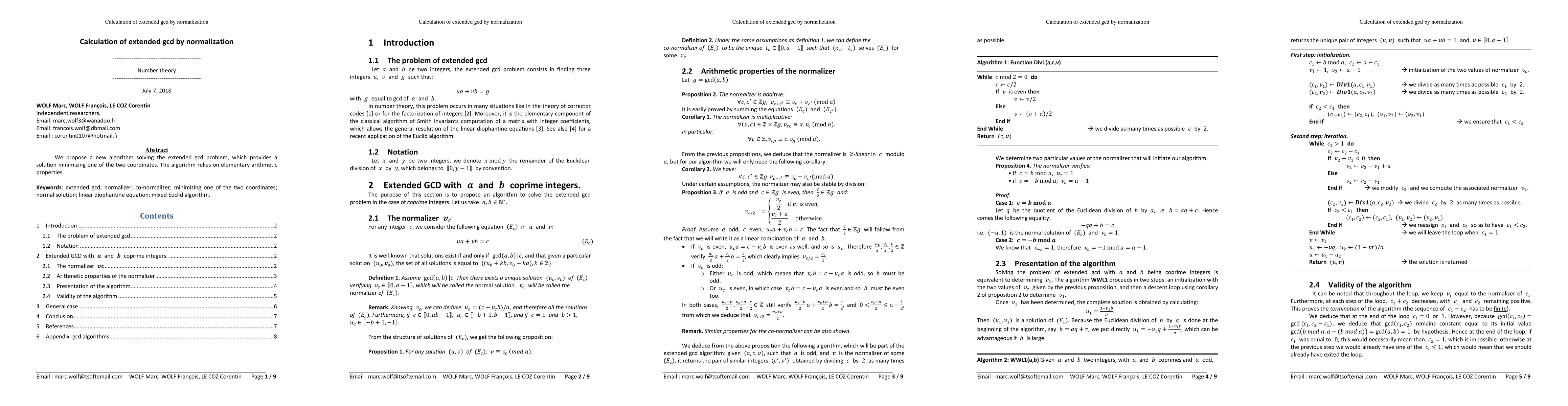 We propose a new algorithm solving the extended gcd problem, which provides a solution minimizing one of the two coordinates. The algorithm relies on elementary arithmetic properties.
