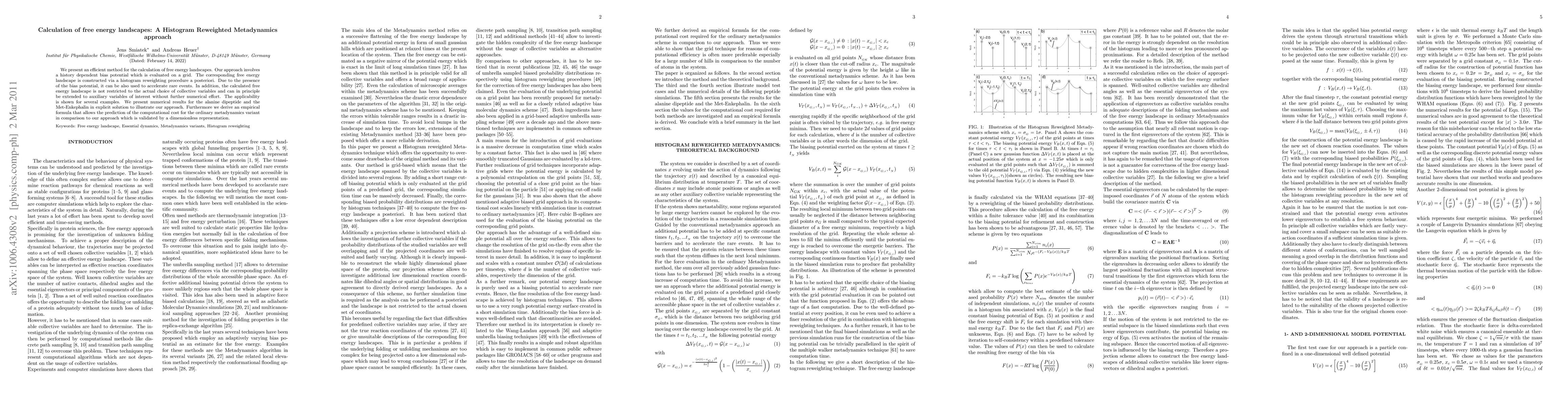 This paper introduces a method using histogram reweighted metadynamics to efficiently calculate free energy landscapes with a history-dependent bias potential, enhancing the exploration of rare events. The approach is demonstrated on alanine dipeptide and Met-Enkephalin, and an empirical formula is derived to predict computational cost differences compared to standard metadynamics.