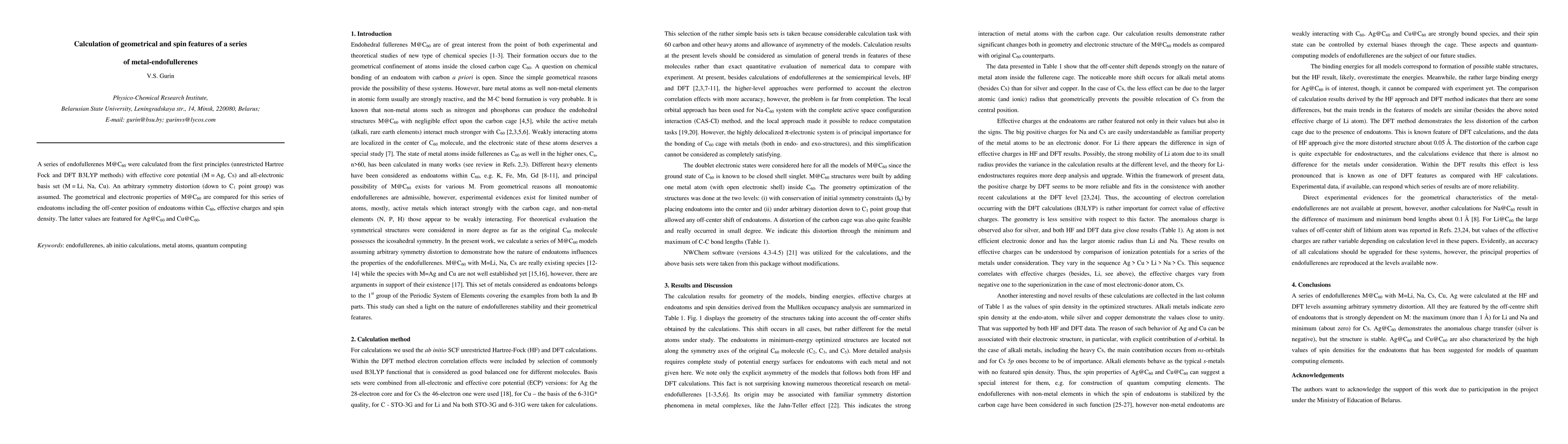 A series of endofullerenes M@C60 were calculated from the first principles (unrestricted Hartree Fock and DFT B3LYP) methods with effective core potential (M = Ag, Cs) and all-electronic basis set (M = Li, Na, Cu). An arbitrary symmetry distortion (down to C1 point group) was assumed. The geometrical and electronic properties of M@C60 are compared for this series of endoatoms including the off-center position of enoatoms within C60, effective charges and spin density. The latter values are featured for Ag@C60 and Cu@C60.