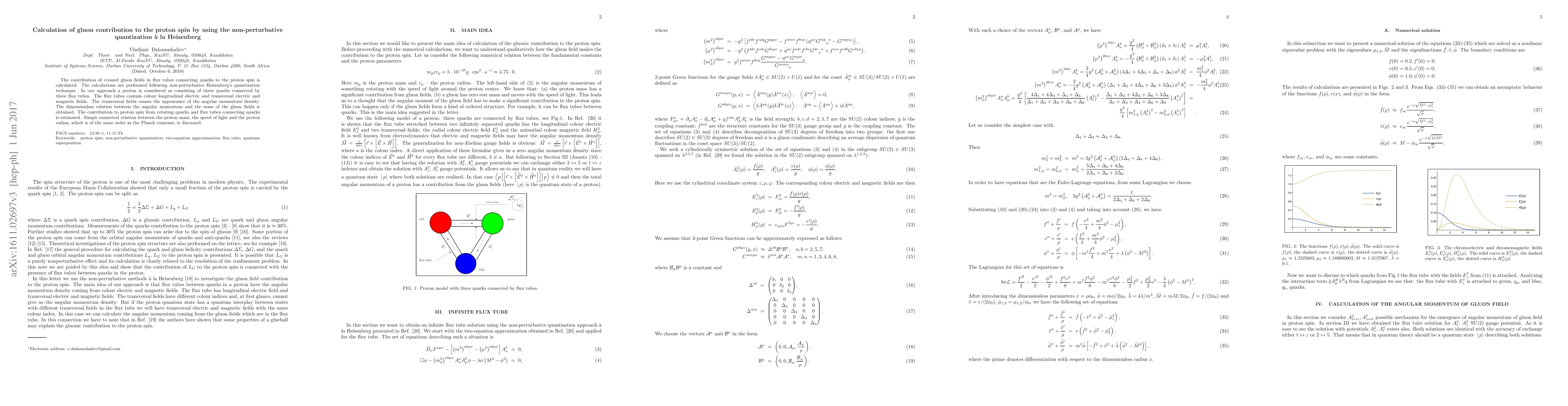 The contribution of crossed gluon fields in flux tubes connecting quarks to the proton spin is calculated. The calculations are performed following non-perturbative Heisenberg's quantization technique. In our approach a proton is considered as consisting of three quarks connected by three flux tubes. The flux tubes contain color longitudinal electric and transversal electric and magnetic fields. The transversal fields causes the appearance of the angular momentum density. The dimensionless relation between the angular momentum and the mass of the gluon fields is obtained. The contribution to proton spin from rotating quarks and flux tubes connecting quarks is estimated. Simple numerical relation between the proton mass, the speed of light and the proton radius, which is of the same order as the Planck constant, is discussed.