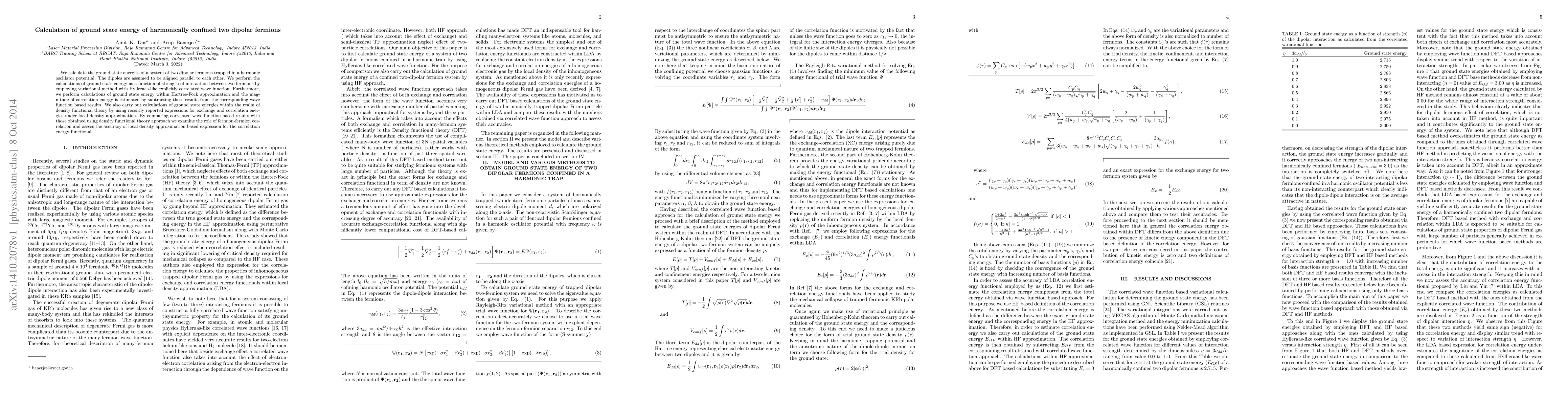 This research calculates the ground state energies of two parallel dipolar fermions in a harmonic oscillator, using variational methods and Hylleraas-like wave functions. It contrasts these with Hartree-Fock and density functional theory results to assess correlation energy and the accuracy of local density approximation.