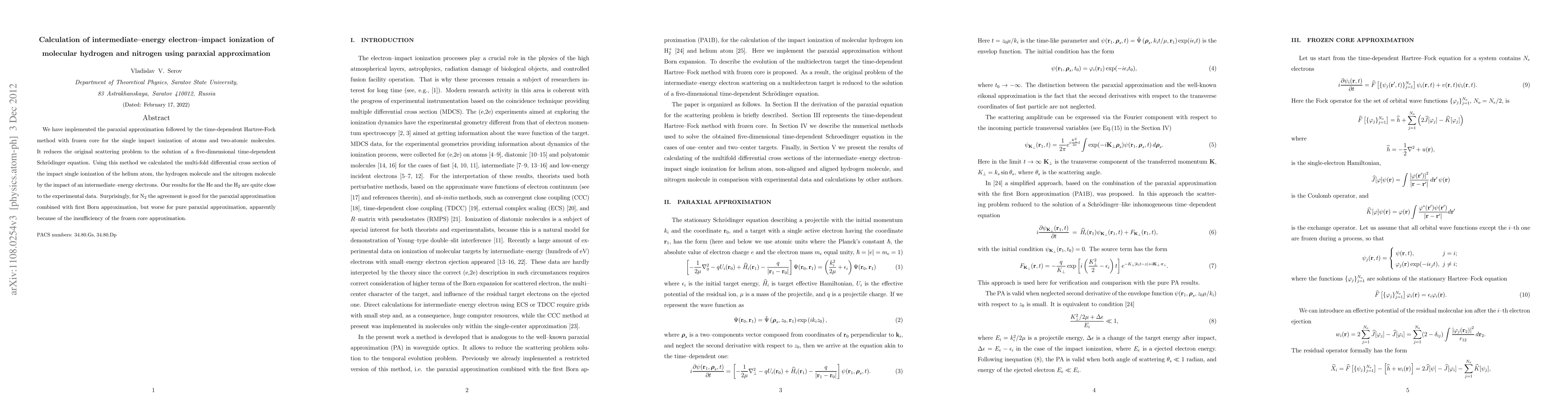 This paper employs the paraxial approximation and time-dependent Hartree-Fock method to calculate electron-impact ionization for helium, hydrogen, and nitrogen. The method yields differential cross sections that closely match experimental data for helium and hydrogen, but shows less agreement for nitrogen due to the limitations of the frozen core approximation.