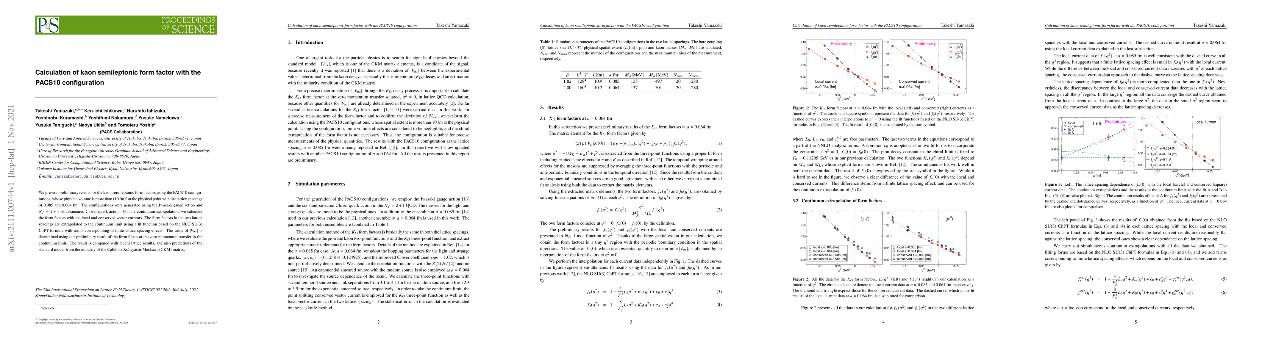 We present preliminary results for the kaon semileptonic form factors using the PACS10 configurations, whose physical volume is more than (10 fm)$^3$ at the physical point with the lattice spacings of 0.085 and 0.064 fm. The configurations were generated using the Iwasaki gauge action and $N_f=2+1$ stout-smeared Clover quark action. For the continuum extrapolation, we calculate the form factors with the local and conserved vector currents. The form factors in the two lattice spacings are extrapolated to the continuum limit using a fit function based on the NLO SU(3) ChPT formula with terms corresponding to finite lattice spacing effects. The value of $|V_{us}|$ is determined using our preliminary result of the form factor at the zero momentum transfer in the continuum limit. The result is compared with recent lattice results, and also predictions of the standard model from the unitarity of the Cabibbo-Kobayashi-Maskawa (CKM) matrix.