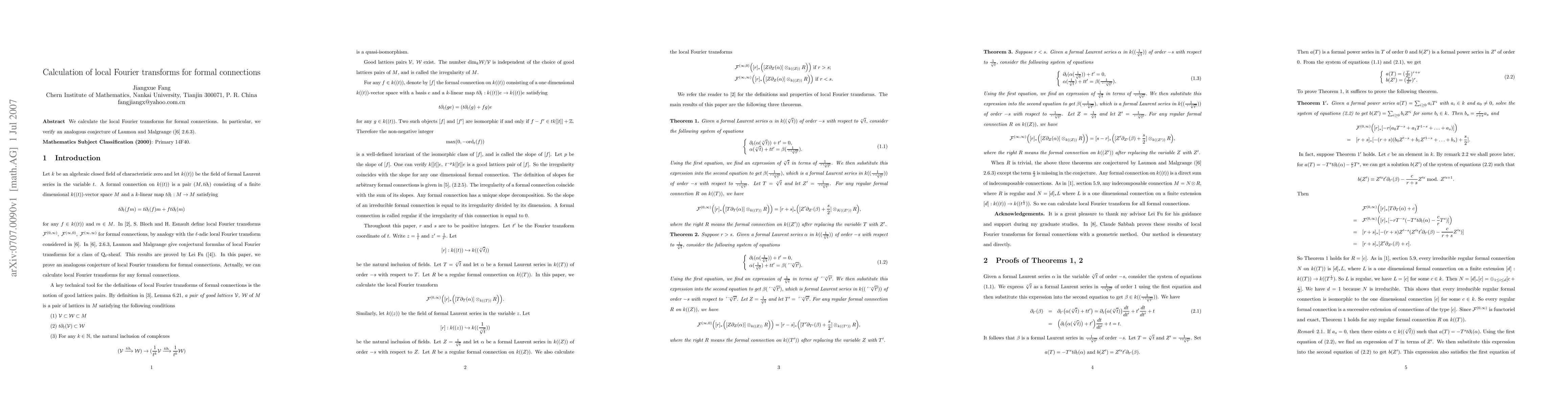 This paper calculates local Fourier transforms for formal connections and verifies a conjecture from Laumon's work regarding functional equations and the Weil conjecture. The study contributes to the understanding of the Fourier transform in the context of formal connections.