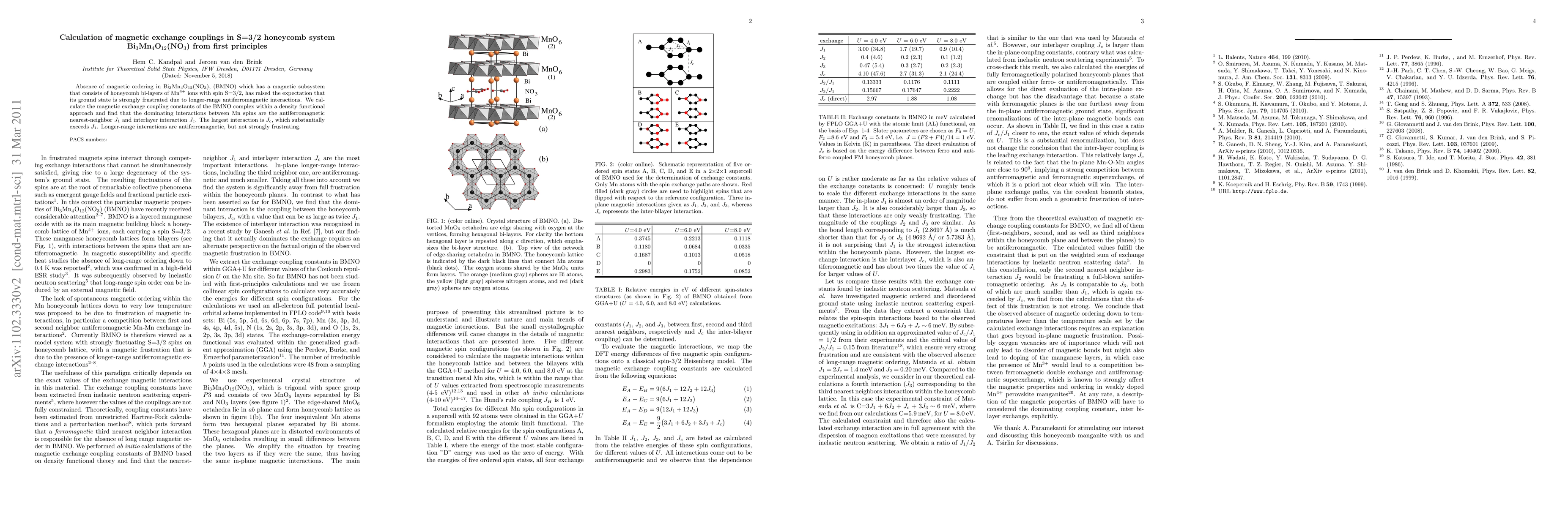 Absence of magnetic ordering in Bi$_3$Mn$_4$O$_{12}$(NO$_3$), (BMNO) which has a magnetic subsystem that consists of honeycomb bi-layers of Mn$^{4+}$ ions with spin S=3/2, has raised the expectation that its ground state is strongly frustrated due to longer-range antiferromagnetic interactions. We calculate the magnetic exchange coupling constants of the BMNO complex within a density functional approach and find that the dominating interactions between Mn spins are the antiferromagnetic nearest-neighbor $J_1$ and interlayer interaction $J_c$. The largest interaction is $J_c$, which substantially exceeds $J_1$. Longer-range interactions are antiferromagnetic, but only weakly frustrating.