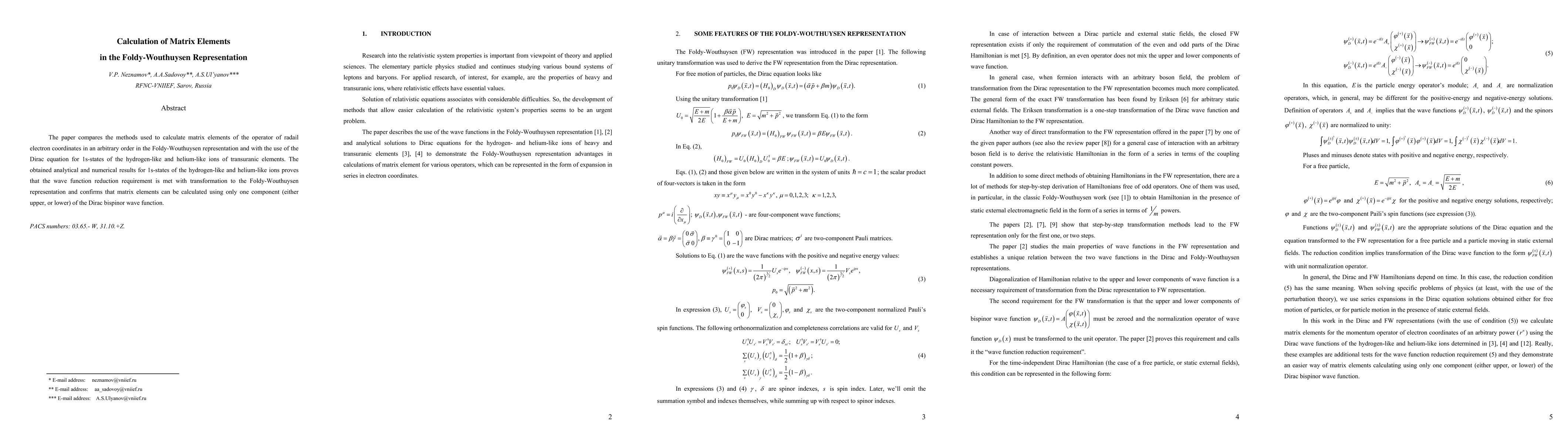 This paper evaluates methods for calculating matrix elements of radial electron coordinates in the Foldy-Wouthuysen representation, demonstrating that the transformation meets wave function reduction requirements and allows matrix elements to be derived from a single component of the Dirac bispinor for 1s-states in hydrogen-like and helium-like transuranic ions.