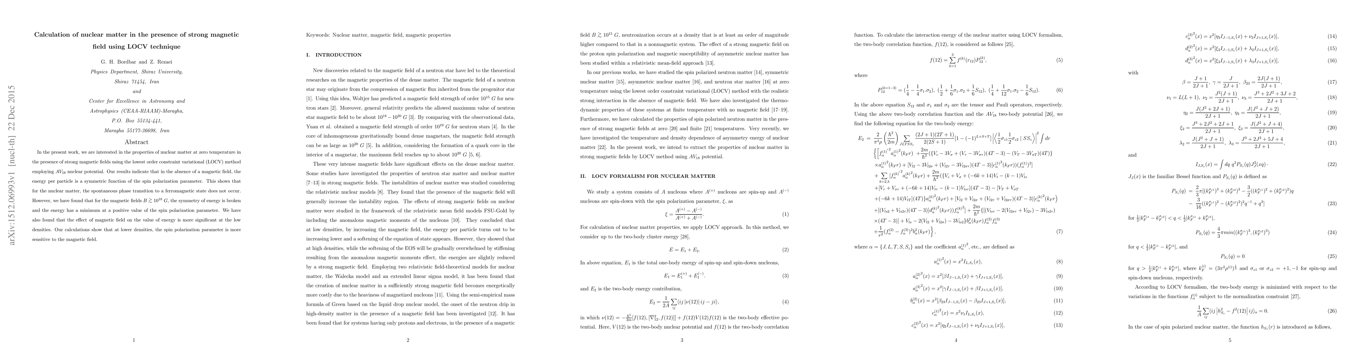 This paper investigates nuclear matter properties under strong magnetic fields using the LOCV method with $AV_{18}$ potential. It finds that without a magnetic field, nuclear matter does not exhibit a spontaneous ferromagnetic phase transition, but at fields above $10^{18}$ G, a symmetry break occurs, indicating a minimum energy at positive spin polarization, with greater effects observed at lower densities.