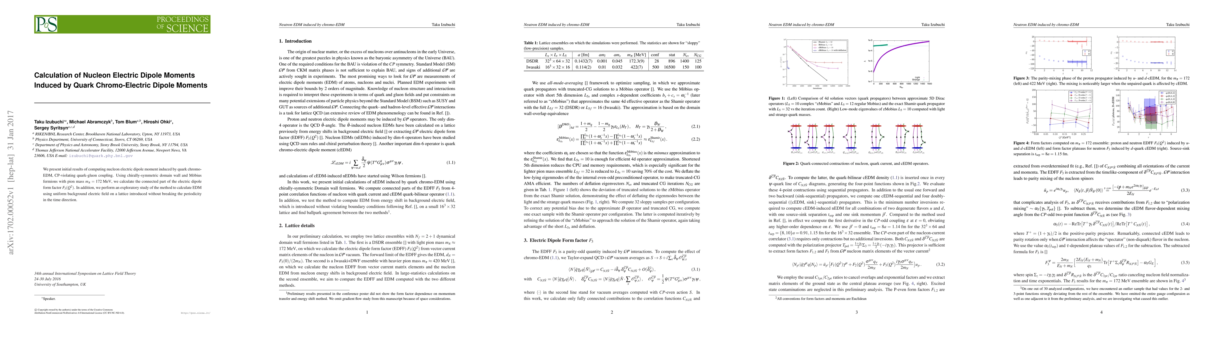 The paper introduces a novel approach to compute nucleon EDM induced by quark chromo-EDM using chirally-symmetric domain wall fermions and tests an alternative method using a uniform background electric field on a lattice.
