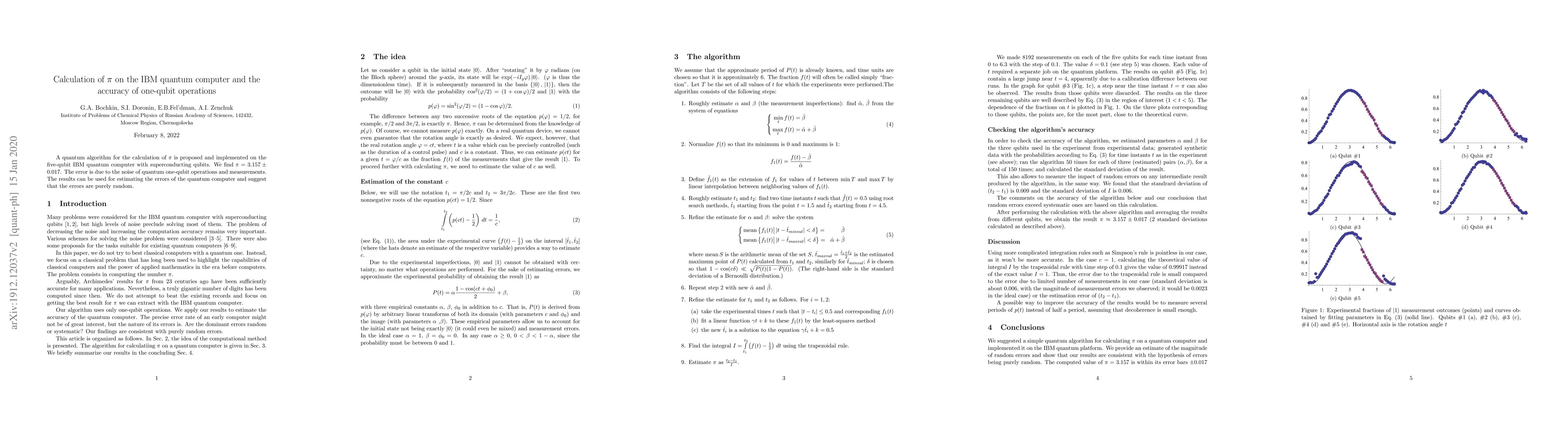 A quantum algorithm for the calculation of $\pi$ is proposed and implemented on the five-qubit IBM quantum computer with superconducting qubits. We find $\pi=3.157\pm0.017$. The error is due to the noise of quantum one-qubit operations and measurements. The results can be used for estimating the errors of the quantum computer and suggest that the errors are purely random.