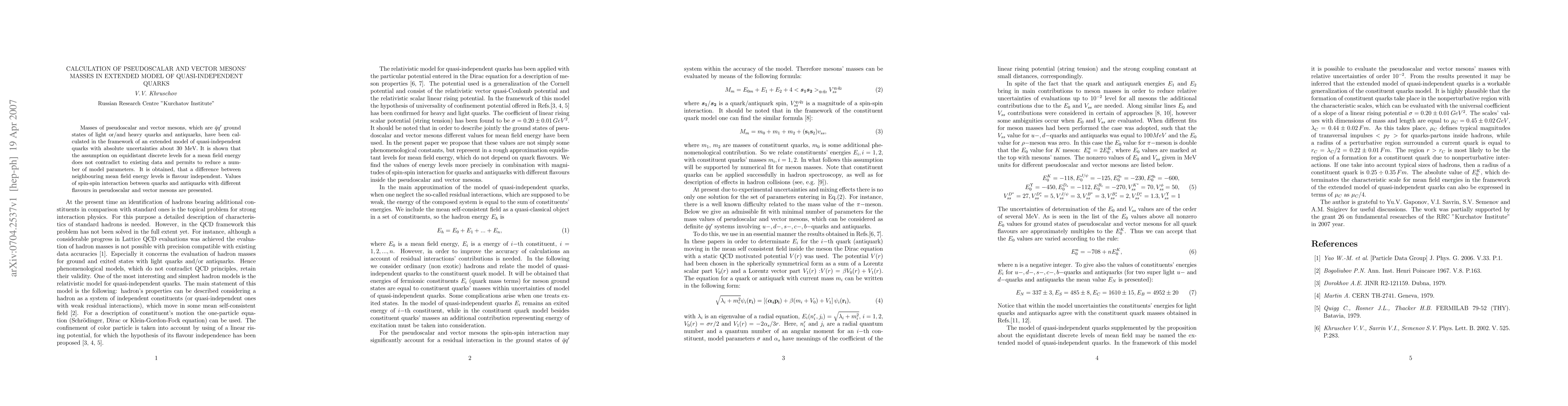 This paper calculates the masses of pseudoscalar and vector mesons in an extended model of quasi-independent quarks, achieving uncertainties of about 30 MeV. The model assumes equidistant discrete levels for mean field energy, which aligns with existing data and simplifies the number of parameters.