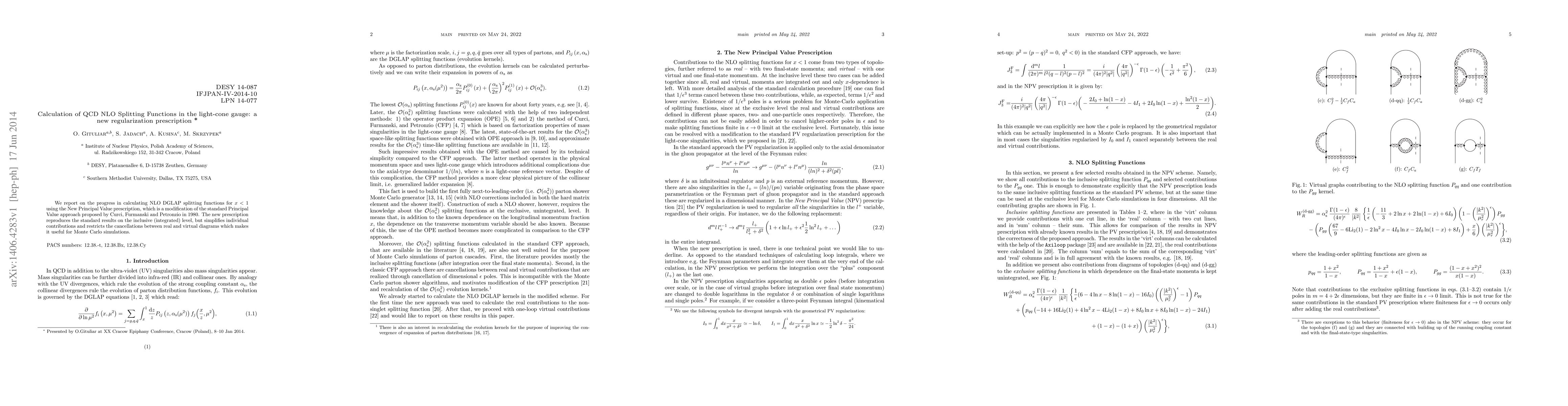 We report on the progress in calculating NLO DGLAP splitting functions for $x<1$ using the New Principal Value prescription, which is a modification of the standard Principal Value approach proposed by Curci, Furmanski and Petronzio in 1980. The new prescription reproduces the standard results on the inclusive (integrated) level, but simplifies individual contributions and restricts the cancellations between real and virtual diagrams which makes it useful for Monte Carlo simulations.