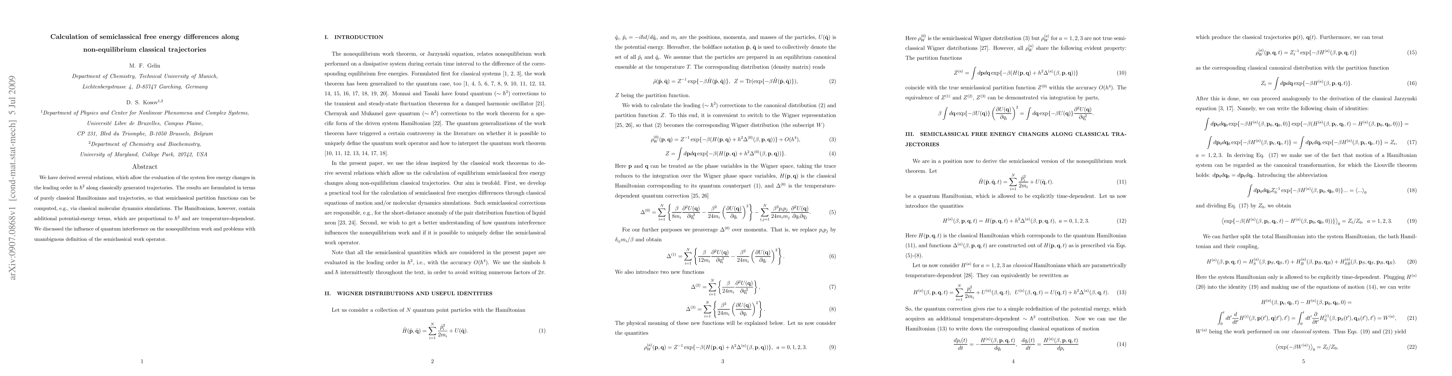 The paper presents semiclassical free energy difference calculations along non-equilibrium classical trajectories, using Hamiltonians with $hbar^{2}$-dependent terms. These can be evaluated via classical MD simulations, while addressing quantum interference impacts on nonequilibrium work and its ambiguous operator definition.