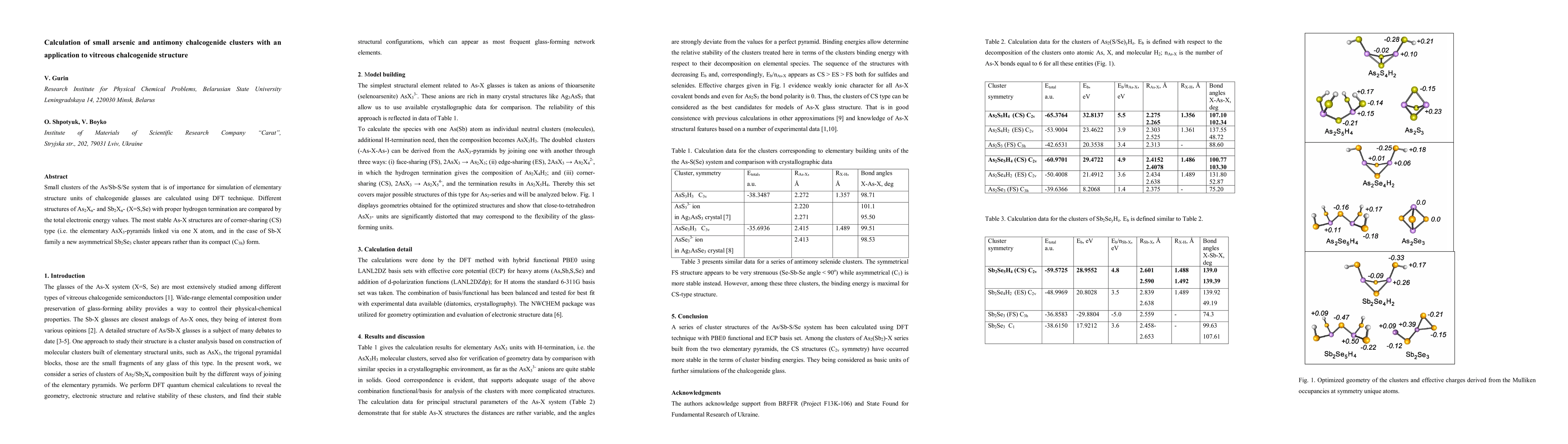 This research uses Density Functional Theory (DFT) to calculate small arsenic and antimony chalcogenide clusters, focusing on As2Xn- and Sb2Xn- (X=S,Se) structures. The most stable configurations are identified, with corner-sharing AsX3 pyramids and a new asymmetrical Sb2Se3 cluster emerging instead of the compact form.