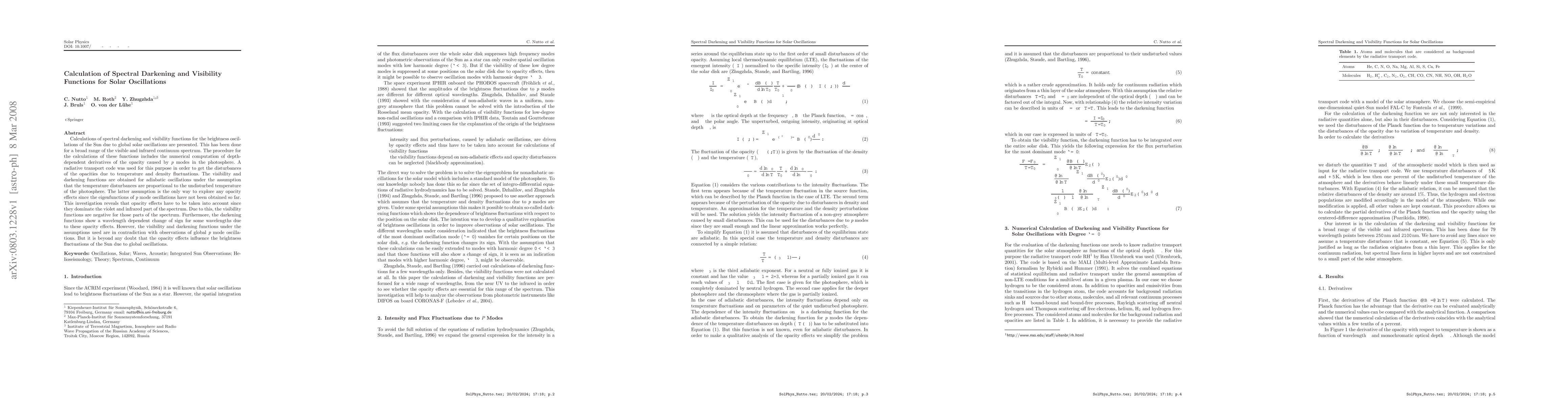 Calculations of spectral darkening and visibility functions for the brightness oscillations of the Sun resulting from global solar oscillations are presented. This has been done for a broad range of the visible and infrared continuum spectrum. The procedure for the calculations of these functions includes the numerical computation of depth-dependent derivatives of the opacity caused by p modes in the photosphere. A radiative-transport code was used for this purpose to get the disturbances of the opacities from temperature and density fluctuations. The visibility and darkening functions are obtained for adiabatic oscillations under the assumption that the temperature disturbances are proportional to the undisturbed temperature of the photosphere. The latter assumption is the only way to explore any opacity effects since the eigenfunctions of p-mode oscillations have not been obtained so far. This investigation reveals that opacity effects have to be taken into account because they dominate the violet and infrared part of the spectrum. Because of this dominance, the visibility functions are negative for those parts of the spectrum. Furthermore, the darkening functions show a wavelength-dependent change of sign for some wavelengths owing to these opacity effects. However, the visibility and darkening functions under the assumptions used contradict the observations of global p-mode oscillations, but it is beyond doubt that the opacity effects influence the brightness fluctuations of the Sun resulting from global oscillations.