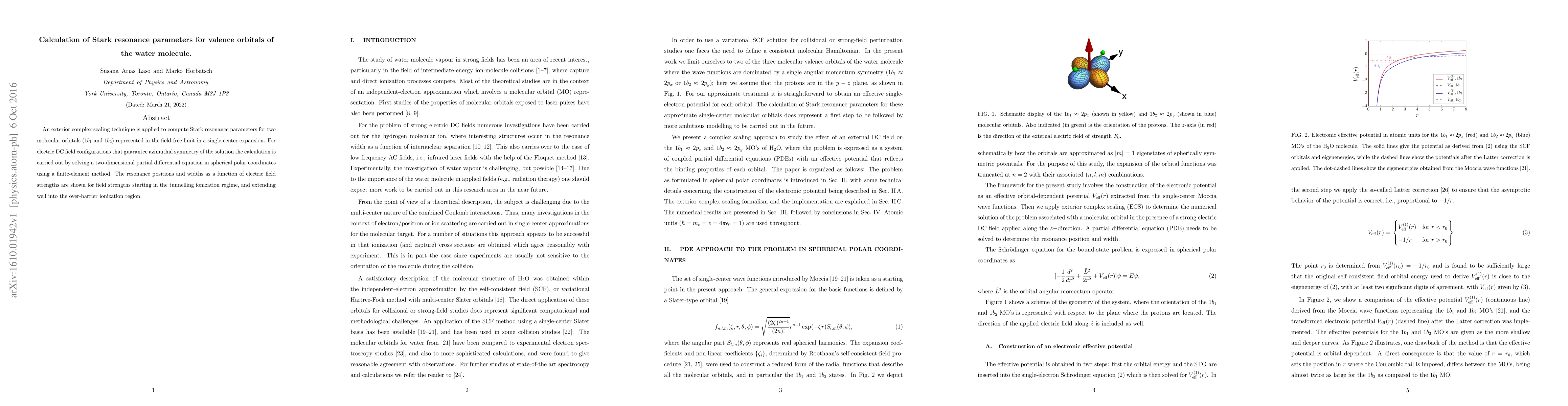 An exterior complex scaling technique is applied to compute Stark resonance parameters for two molecular orbitals ($1b_{1}$ and $1b_{2}$) represented in the field-free limit in a single-center expansion. For electric DC field configurations that guarantee azimuthal symmetry of the solution the calculation is carried out by solving a two-dimensional partial differential equation in spherical polar coordinates using a finite-element method. The resonance positions and widths as a function of electric field strengths are shown for field strengths starting in the tunnelling ionization regime, and extending well into the over-barrier ionization region.