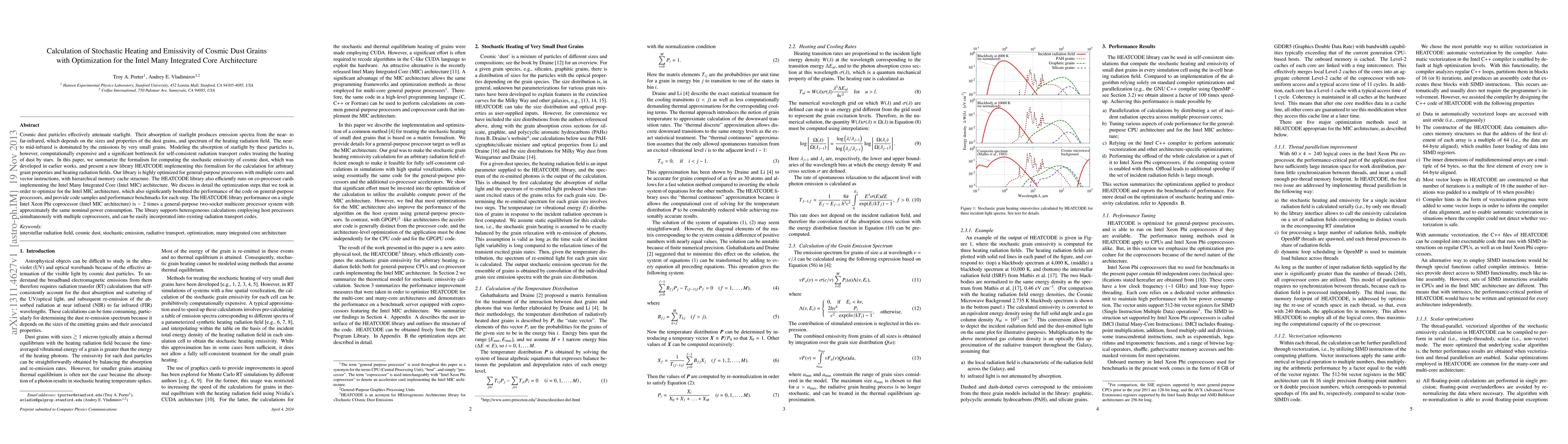 This paper presents the HEATCODE library for calculating the stochastic heating and emissivity of cosmic dust grains, optimized for the Intel Many Integrated Core architecture. It significantly improves the performance of radiation transport codes by efficiently running on both general-purpose processors and Intel Xeon Phi coprocessors, achieving nearly double the performance of traditional multicore systems.