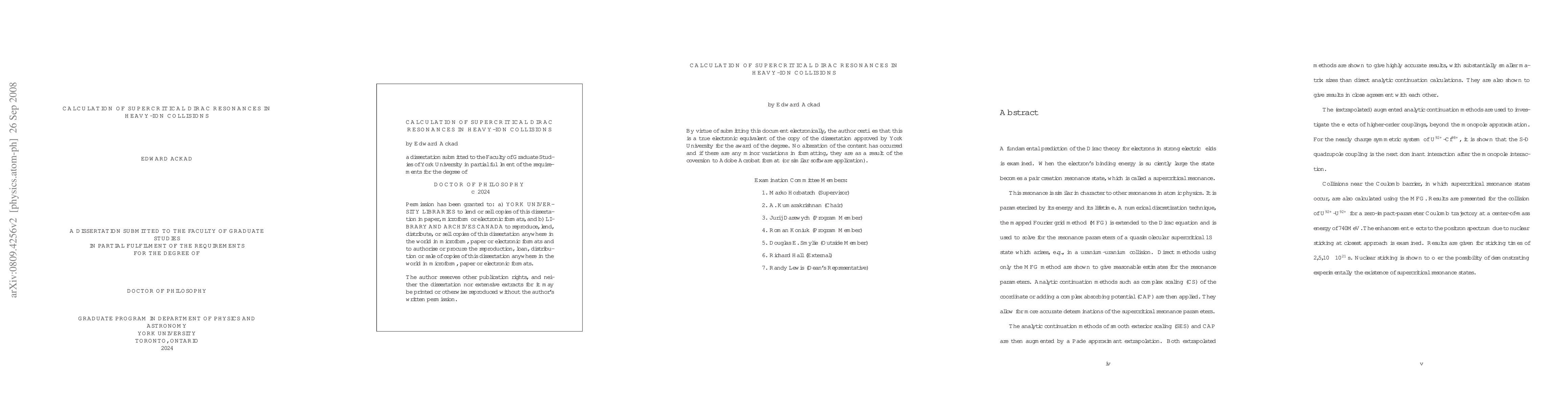 This resonance is similar in character to other resonances in atomic physics. It is parameterized by its energy and its lifetime. A numerical discretization technique, the mapped Fourier grid method (MFG) is extended to the Dirac equation and is used to solve for the resonance parameters of a quasimolecular supercritical 1S$\sigma$ state which arises, e.g., in a uranium-uranium collision. Direct methods using only the MFG method are shown to give reasonable estimates for the resonance parameters. Analytic continuation methods such as complex scaling (CS) of the coordinate or adding a complex absorbing potential (CAP) are then applied. They allow for more accurate determinations of the supercritical resonance parameters. The (extrapolated) augmented analytic continuation methods are used to investigate the effects of higher-order couplings, beyond the monopole approximation. For the nearly charge symmetric system of U$^{92+}$-Cf$^{98+}$, it is shown that the S-D quadrupole coupling is the next dominant interaction after the monopole interaction. Collisions near the Coulomb barrier, in which supercritical resonance states occur, are also calculated using the MFG. Results are presented for the collision of U$^{92+}$-U$^{92+}$ for a zero-impact-parameter Coulomb trajectory at a center-of-mass energy of 740MeV. The enhancement effects to the positron spectrum due to nuclear sticking at closest approach is examined. Results are given for sticking times of 2,5,10$\times10^{-21}$s. Nuclear sticking is shown to offer the possibility of demonstrating experimentally the existence of supercritical resonance states.