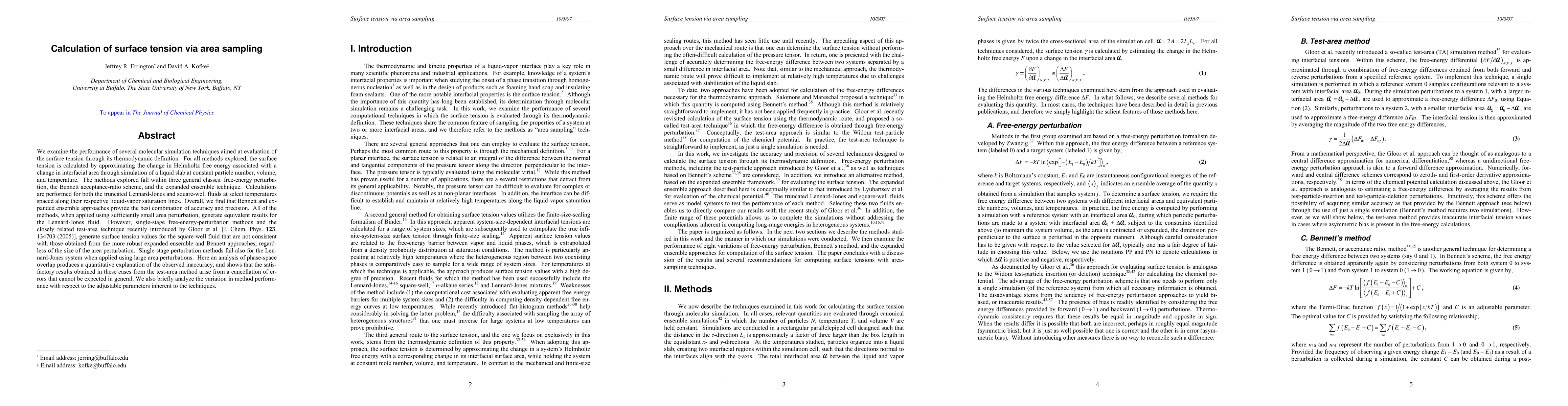 We examine the performance of several molecular simulation techniques aimed at evaluation of the surface tension through its thermodynamic definition. For all methods explored, the surface tension is calculated by approximating the change in Helmholtz free energy associated with a change in interfacial area through simulation of a liquid slab at constant particle number, volume, and temperature. The methods explored fall within three general classes: free-energy perturbation, the Bennett acceptance-ratio scheme, and the expanded ensemble technique. Calculations are performed for both the truncated Lennard-Jones and square-well fluids at select temperatures spaced along their respective liquid-vapor saturation lines. Overall, we find that Bennett and expanded ensemble approaches provide the best combination of accuracy and precision. All of the methods, when applied using sufficiently small area perturbation, generate equivalent results for the Lennard-Jones fluid. However, single-stage free-energy-perturbation methods and the closely related test-area technique recently introduced by Gloor et al. [J. Chem. Phys. 123, 134703 (2005)], generate surface tension values for the square-well fluid that are not consistent with those obtained from the more robust expanded ensemble and Bennett approaches, regardless of the size of the area perturbation. Single-stage perturbation methods fail also for the Lennard-Jones system when applied using large area perturbations. Here an analysis of phase-space overlap produces a quantitative explanation of the observed inaccuracy, and shows that the satisfactory results obtained in these cases from the test-area method arise from a cancellation of errors that cannot be expected in general.