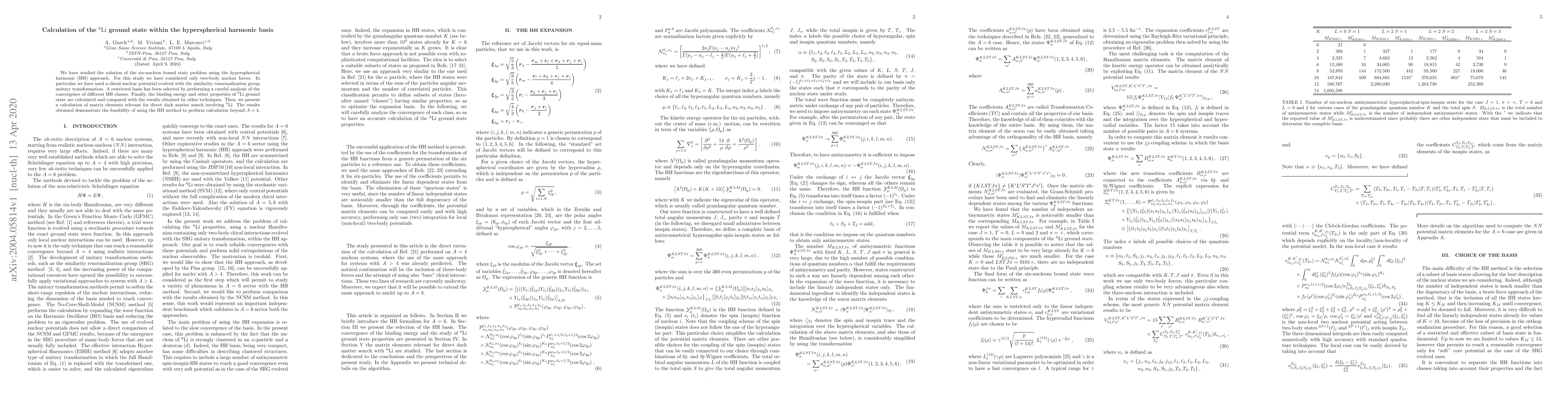 We have studied the solution of the six-nucleon bound state problem using the hyperspherical harmonic (HH) approach. For this study we have considered only two-body nuclear forces. In particular we have used a chiral nuclear potential evolved with the similarity renormalization group unitary transformation. A restricted basis has been selected by performing a careful analysis of the convergence of different HH classes. Finally, the binding energy and other properties of ${}^6$Li ground state are calculated and compared with the results obtained by other techniques. Then, we present a calculation of matrix elements relevant for direct dark matter search involving ${}^6$Li. The results obtained demonstrate the feasibility of using the HH method to perform calculation beyond $A = 4$.