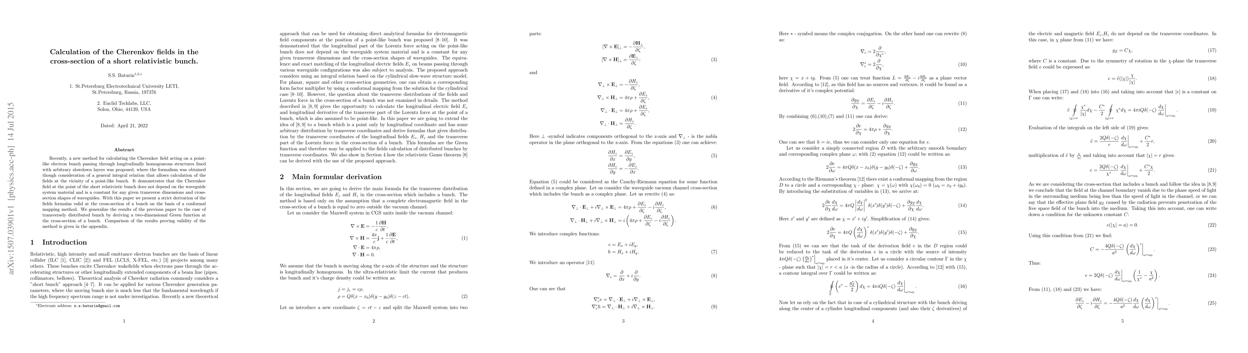 Recently, a new method for calculating the Cherenkov field acting on a point-like electron bunch passing through longitudinally homogeneous structures lined with arbitrary slowdown layers was proposed, where the formalism was obtained though consideration of a general integral relation that allows calculation of the fields at the vicinity of a point-like bunch. It demonstrates that the Cherenkov field at the point of the short relativistic bunch does not depend on the waveguide system material and is a constant for any given transverse dimensions and cross-section shapes of waveguides. With this paper we present a strict derivation of the fields formulas valid at the cross-section of a bunch on the basis of a conformal mapping method. We generalize the results of the previous paper to the case of transversely distributed bunch by deriving a two-dimensional Green function at the cross-section of a bunch. Comparison of the results proving validity of the method is given in the appendix.