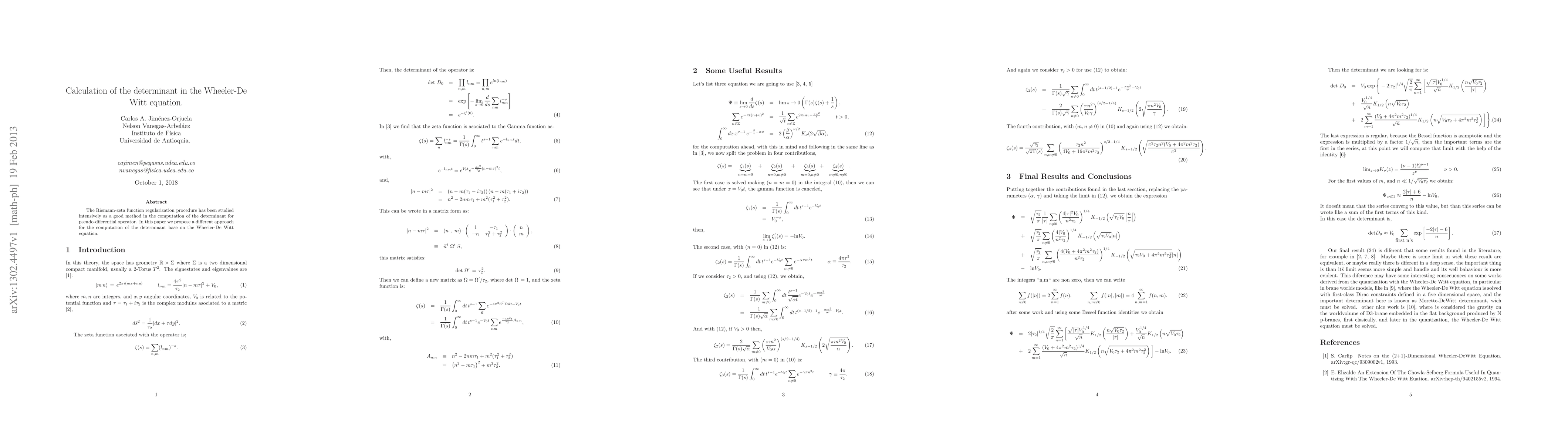 The Riemann-zeta function regularization procedure has been studied intensively as a good method in the computation of the determinant for pseudo-diferential operator. In this paper we propose a different approach for the computation of the determinant base on the Wheeler-De Witt equation.