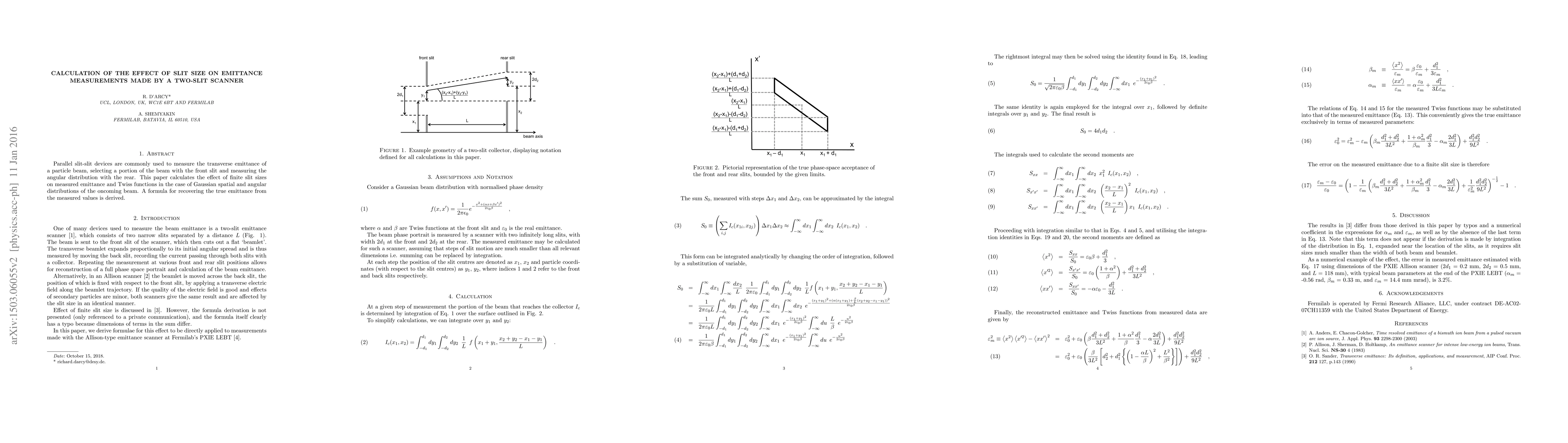 Parallel slit-slit devices are commonly used to measure the transverse emittance of a particle beam, selecting a portion of the beam with the front slit and measuring the angular distribution with the rear. This paper calculates the effect of finite slit sizes on measured emittance and Twiss functions in the case of Gaussian spatial and angular distributions of the oncoming beam. A formula for recovering the true emittance from the measured values is derived.