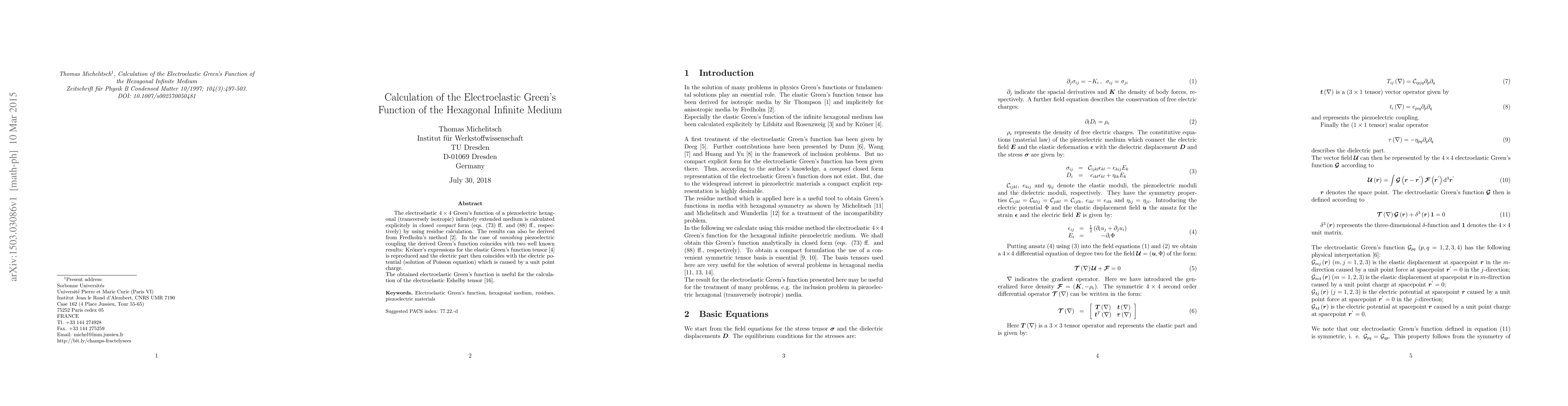 The electroelastic 4 $\times$ 4 Green's function of a piezoelectric hexagonal (transversely isotropic) infinitely extended medium is calculated explicitly in closed compact form (eqs. (73) ff. and (88) ff., respectively) by using residue calculation. The results can also be derived from Fredholm's method [2]. In the case of vanishing piezoelectric coupling the derived Green's function coincides with two well known results: Kr{\"o}ner 's expressions for the elastic Green's function tensor [4] is reproduced and the electric part then coincides with the electric potential (solution of Poisson equation) which is caused by a unit point charge. The obtained electroelastic Green's function is useful for the calculation of the electroelastic Eshelby tensor [16].