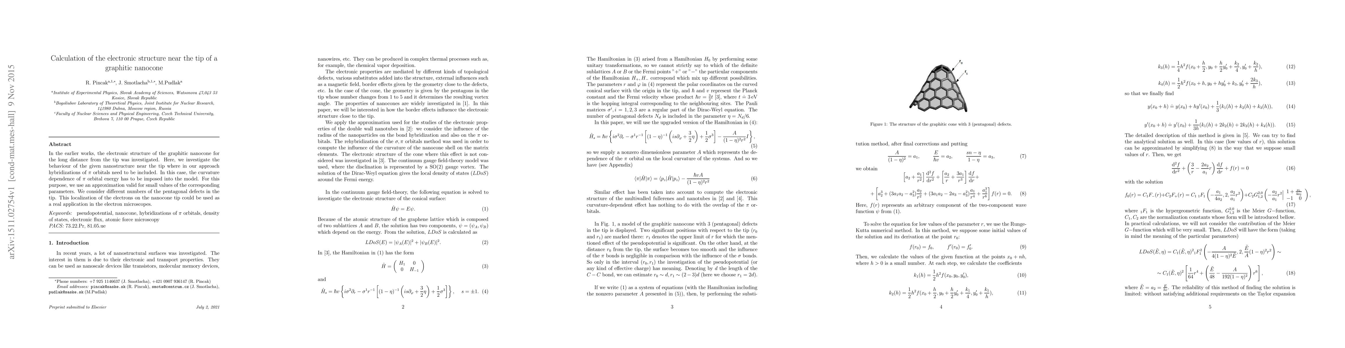 In the earlier works, the electronic structure of the graphitic nanocone for the long distance from the tip was investigated. Here, we investigate the behaviour of the given nanostructure near the tip where in our approach hybridizations of pi-orbitals need to be included. In this case, the curvature dependence of pi-orbital energy has to be imposed into the model. For this purpose, we use an approximation valid for small values of the corresponding parameters. We consider different numbers of the pentagonal defects in the tip. This localization of the electrons on the nanocone tip could be used as a real application in the electron microscopes.
