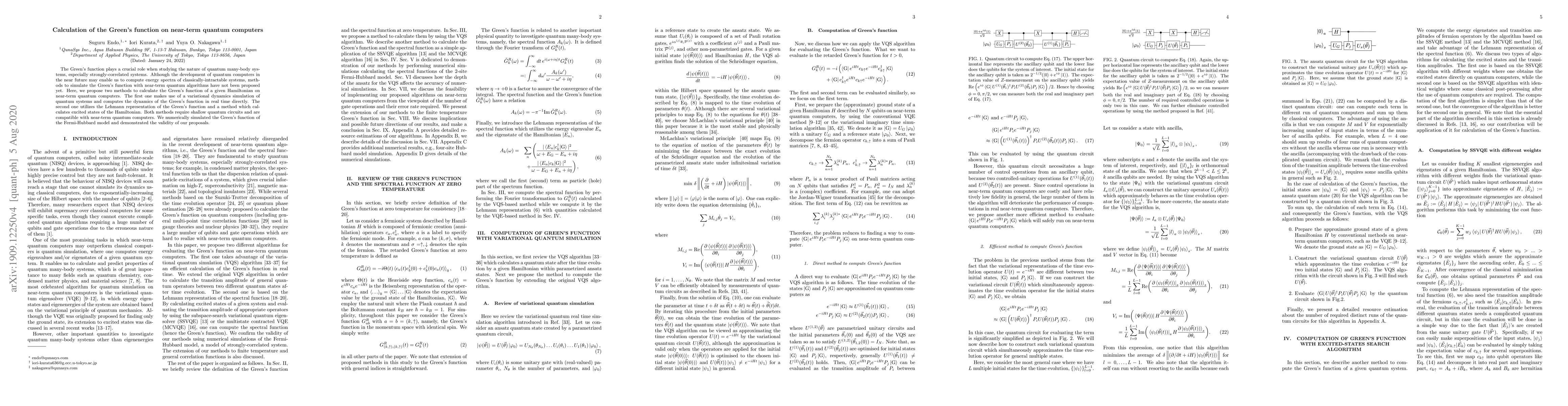 This paper proposes two methods for calculating the Green's function on near-term quantum computers, essential for studying quantum many-body systems. The first method uses variational dynamics, while the second employs the Lehmann representation and excited state calculations, both requiring shallow quantum circuits.