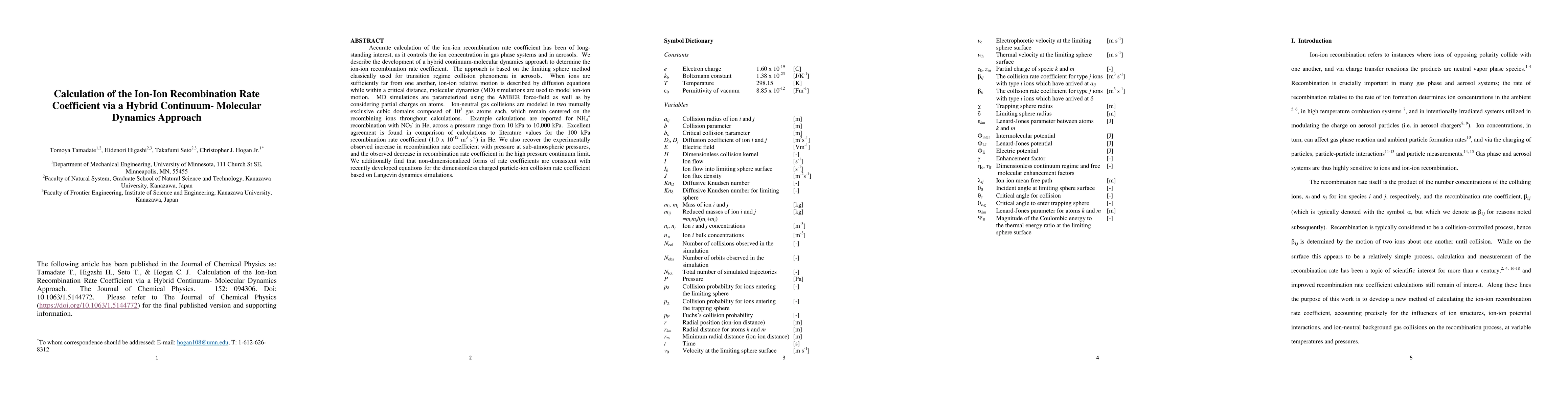 This paper develops a hybrid continuum-molecular dynamics approach to calculate the ion-ion recombination rate coefficient, combining diffusion equations for distant ions and molecular dynamics for close interactions. The method accurately reproduces experimental observations and literature values for NH4+ recombination with NO2- in He across a wide pressure range.