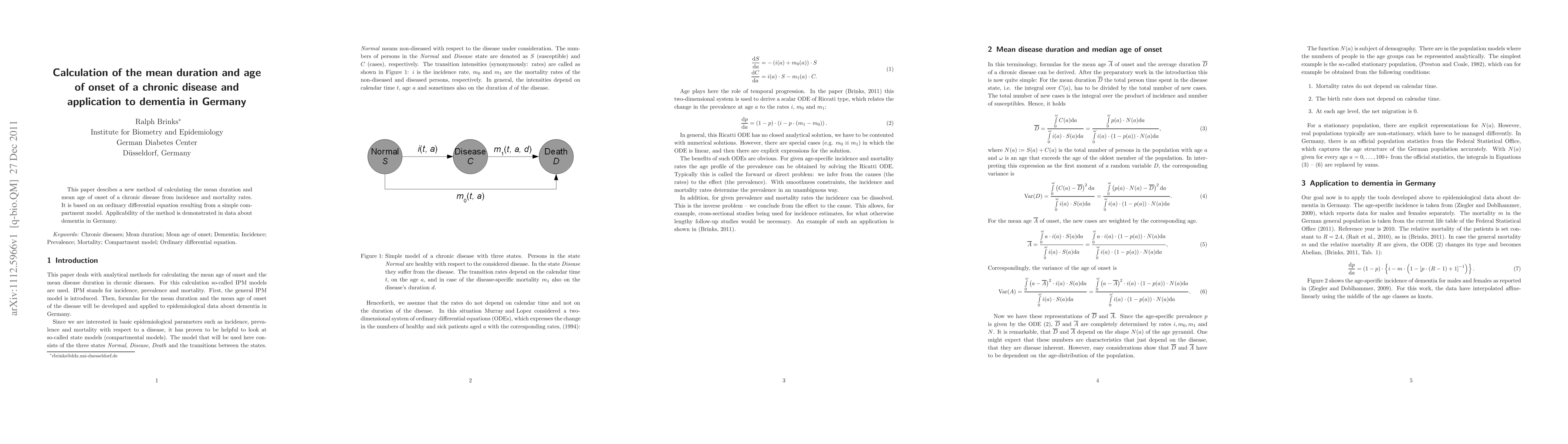 This paper descibes a new method of calculating the mean duration and mean age of onset of a chronic disease from incidence and mortality rates. It is based on an ordinary differential equation resulting from a simple compartment model. Applicability of the method is demonstrated in data about dementia in Germany.