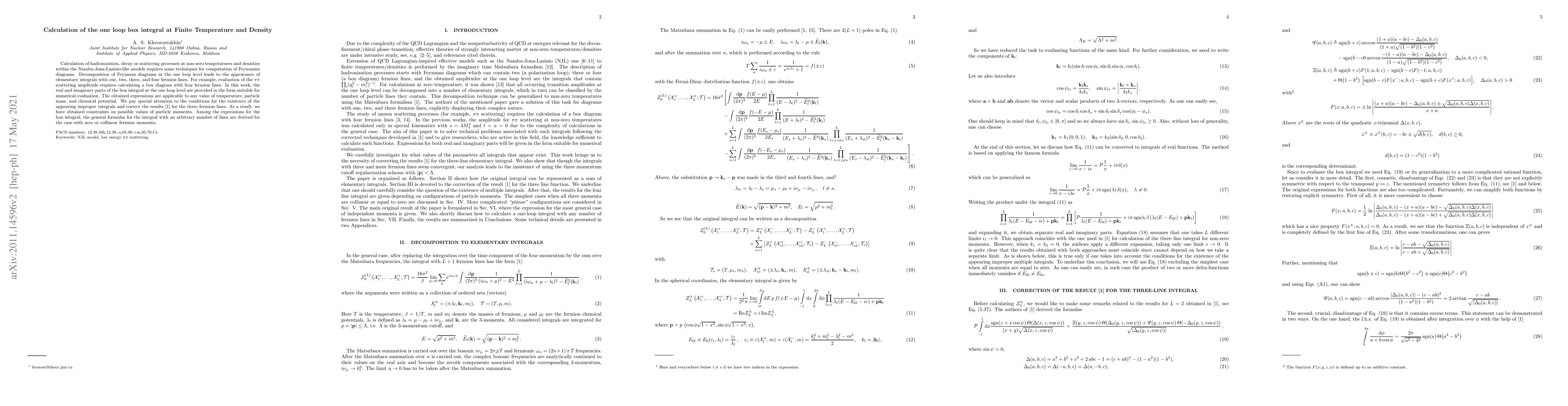 Calculation of hadronization, decay or scattering processes at non-zero temperatures and densities within the Nambu-Jona-Lasinio-like models requires some techniques for computation of Feynmann diagrams. Decomposition of Feynman diagrams at the one loop level leads to the appearance of elementary integrals with one, two, three, and four fermion lines. For example, evaluation of the $\pi\pi$ scattering amplitude requires calculating a box diagram with four fermion lines. In this work, the real and imaginary parts of the box integral at the one loop level are provided in the form suitable for numerical evaluation. The obtained expressions are applicable to any value of temperature, particle mass, and chemical potential. We pay special attention to the conditions for the existence of the appearing improper integrals and correct the results \cite{Klevansky} for the three fermion lines. As a result, we have obtained constraints on possible values of particle momenta. Among the expressions for the box integral, the general formulas for the integral with an arbitrary number of lines are derived for the case with zero or collinear fermion momenta.