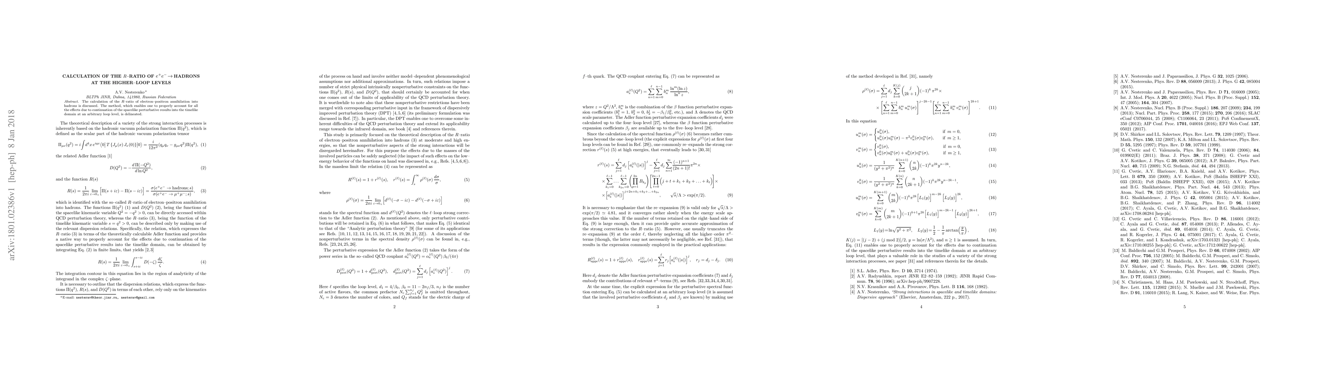 This paper presents a method for calculating the R-ratio in electron-positron annihilation into hadrons, accounting for all effects from perturbative results across various loop levels, including the transition from spacelike to timelike domains.