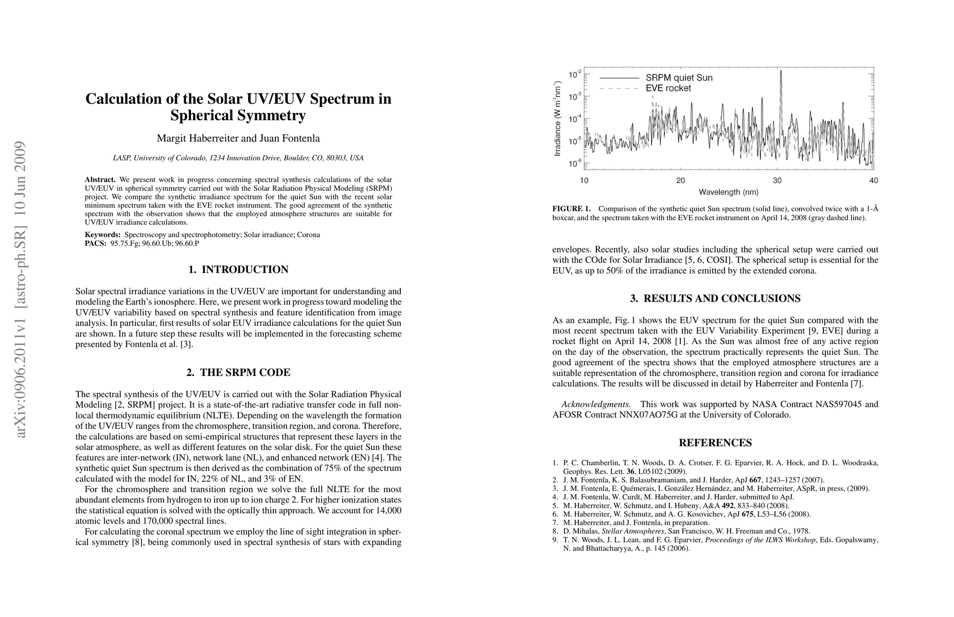 This paper reports on spectral synthesis calculations of solar UV/EUV radiation in spherical symmetry, conducted within the SRPM project. The synthetic irradiance spectrum for the quiet Sun aligns well with observations from the EVE instrument, validating the employed atmospheric models.