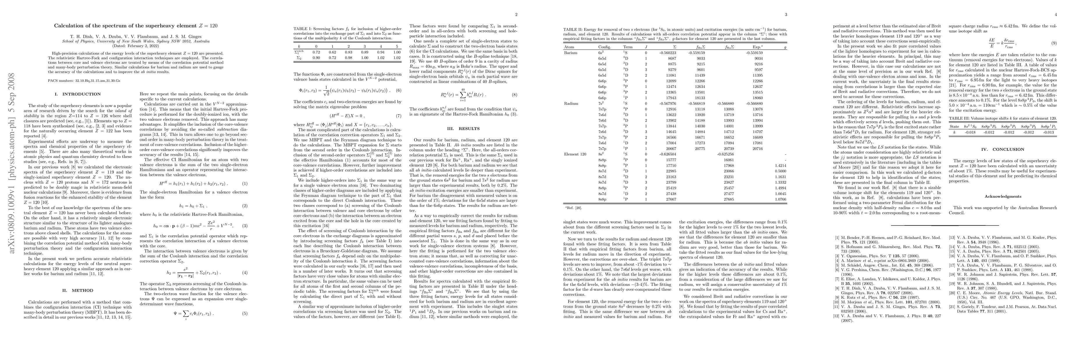 High-precision calculations of the energy levels of the superheavy element Z=120 are presented. The relativistic Hartree-Fock and configuration interaction techniques are employed. The correlations between core and valence electrons are treated by means of the correlation potential method and many-body perturbation theory. Similar calculations for barium and radium are used to gauge the accuracy of the calculations and to improve the ab initio results.