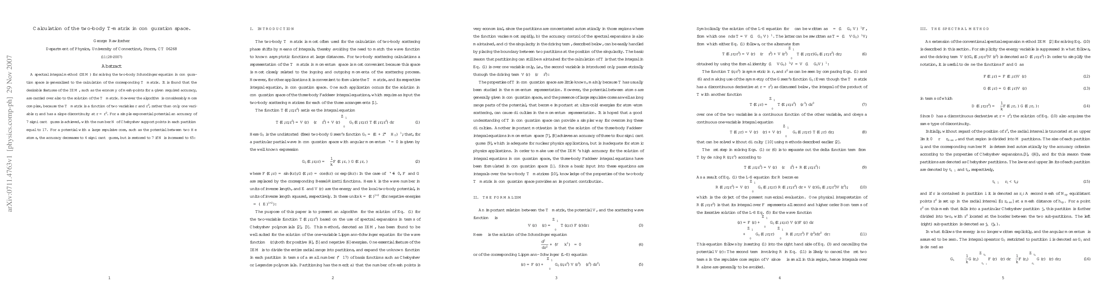 This paper generalizes a spectral integral method for solving the two-body Schrödinger equation to calculate the T-matrix in configuration space, achieving high accuracy with fewer mesh points. The method's complexity increases due to the T-matrix's two-variable nature and its slope discontinuity.
