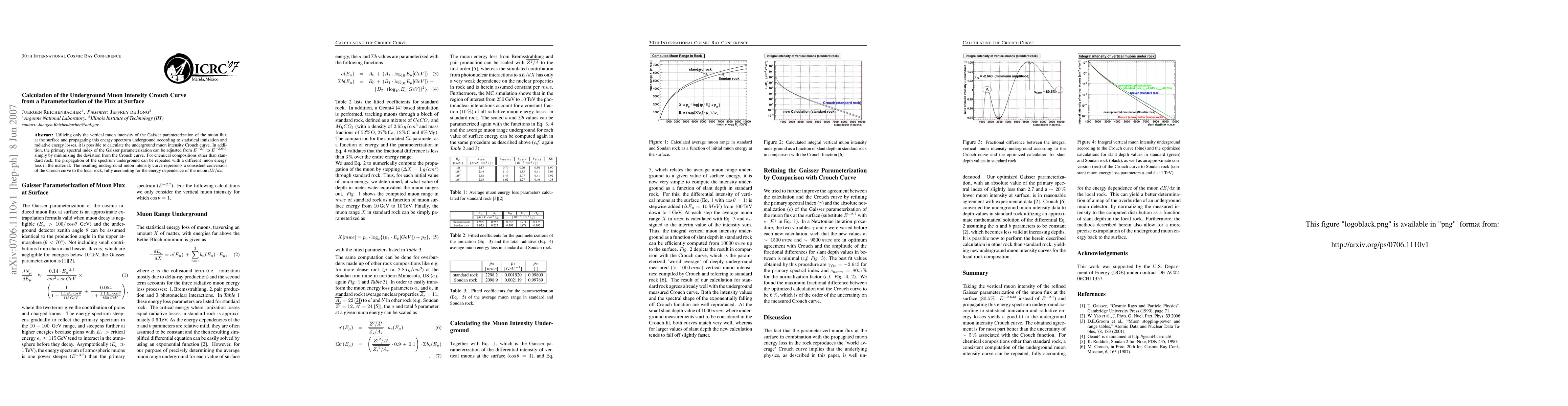 Utilizing only the vertical muon intensity of the Gaisser parameterization of the muon flux at the surface and propagating this energy spectrum underground according to statistical ionization and radiative energy losses, it is possible to calculate the underground muon intensity Crouch curve. In addition, the primary spectral index of the Gaisser parameterization can be adjusted from $E^{-2.7}$ to $E^{-2.643}$ simply by minimizing the deviation from the Crouch curve. For chemical compositions other than standard rock, the propagation of the spectrum underground can be repeated with a different muon energy loss in the material. The resulting underground muon intensity curve represents a consistent conversion of the Crouch curve to the local rock, fully accounting for the energy dependence of the muon $dE/dx$.