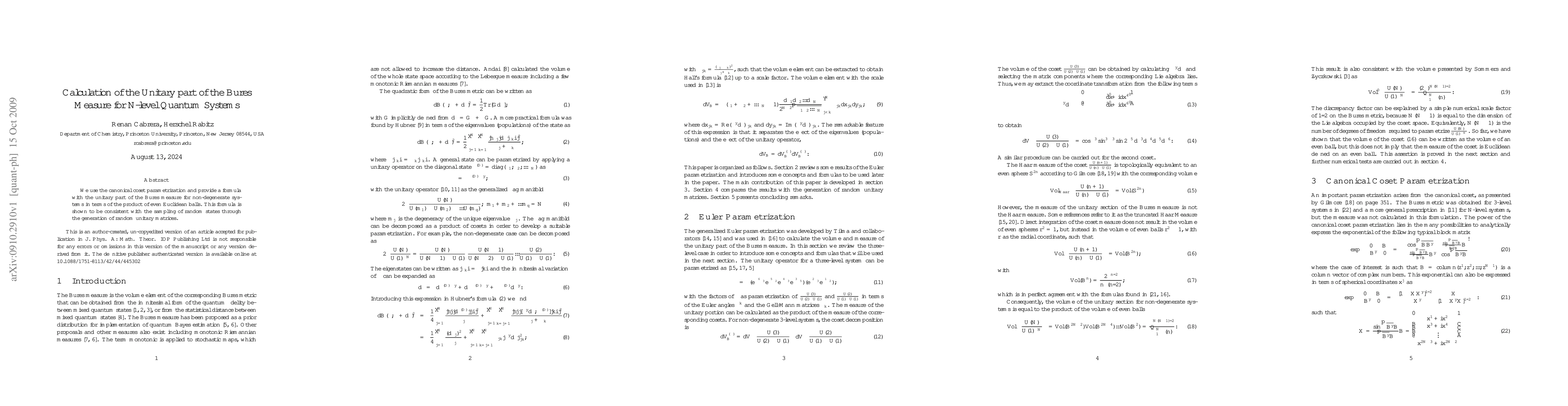 Summary: The paper derives a formula for the unitary part of the Bures measure in N-level quantum systems using canonical coset parameterization, demonstrating consistency with random unitary matrix sampling for non-degenerate systems.