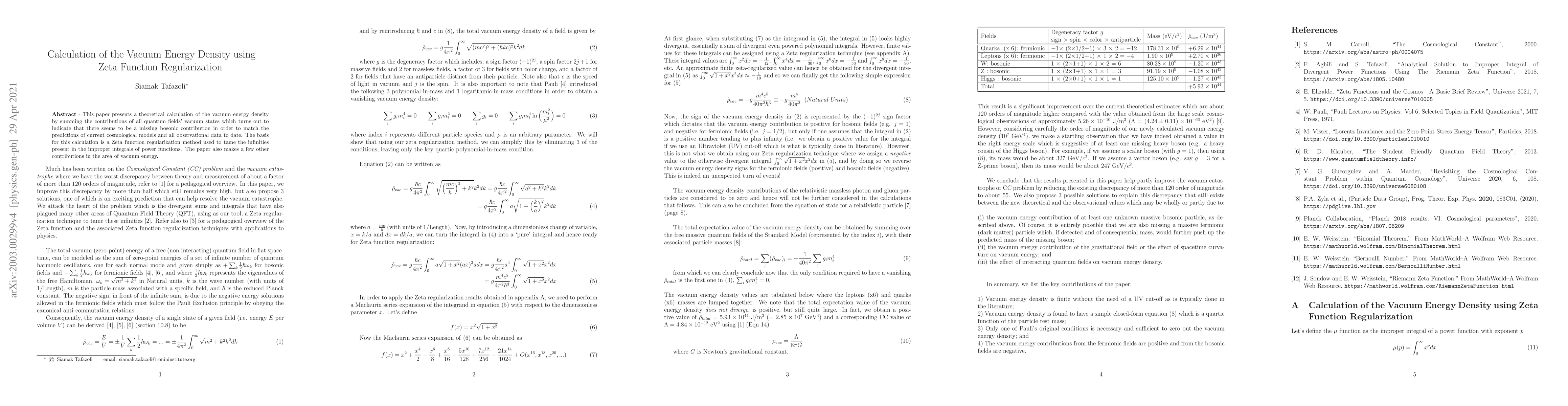 This paper presents a theoretical calculation of the vacuum energy density by summing the contributions of all quantum fields vacuum states which turns out to indicate that there seems to be a missing bosonic contribution in order to match the predictions of current cosmological models and all observational data to date. The basis for this calculation is a Zeta function regularization method used to tame the infinities present in the improper integrals of power functions.