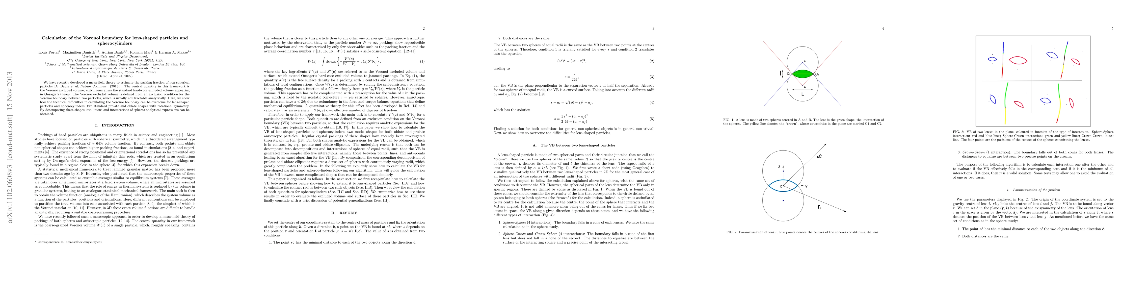 We have recently developed a mean-field theory to estimate the packing fraction of non-spherical particles [A. Baule et al., Nature Commun. (2013)]. The central quantity in this framework is the Voronoi excluded volume, which generalizes the standard hard-core excluded volume appearing in Onsager's theory. The Voronoi excluded volume is defined from an exclusion condition for the Voronoi boundary between two particles, which is usually not tractable analytically. Here, we show how the technical difficulties in calculating the Voronoi boundary can be overcome for lens-shaped particles and spherocylinders, two standard prolate and oblate shapes with rotational symmetry. By decomposing these shapes into unions and intersections of spheres analytical expressions can be obtained.