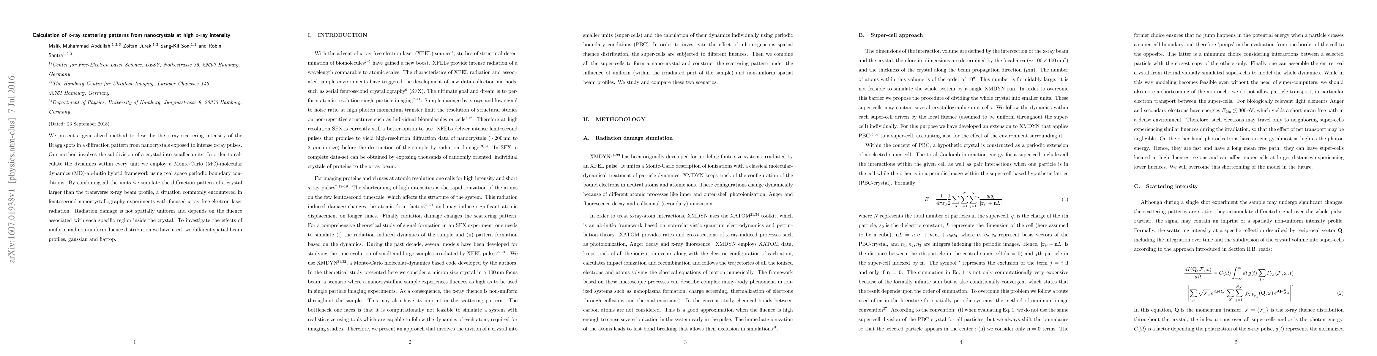 We present a generalized method to describe the x-ray scattering intensity of the Bragg spots in a diffraction pattern from nanocrystals exposed to intense x-ray pulses. Our method involves the subdivision of a crystal into smaller units. In order to calculate the dynamics within every unit we employ a Monte-Carlo (MC)-molecular dynamics (MD)-ab-initio hybrid framework using real space periodic boundary conditions. By combining all the units we simulate the diffraction pattern of a crystal larger than the transverse x-ray beam profile, a situation commonly encountered in femtosecond nanocrystallography experiments with focused x-ray free-electron laser radiation. Radiation damage is not spatially uniform and depends on the fluence associated with each specific region inside the crystal. To investigate the effects of uniform and non-uniform fluence distribution we have used two different spatial beam profiles, gaussian and flattop.