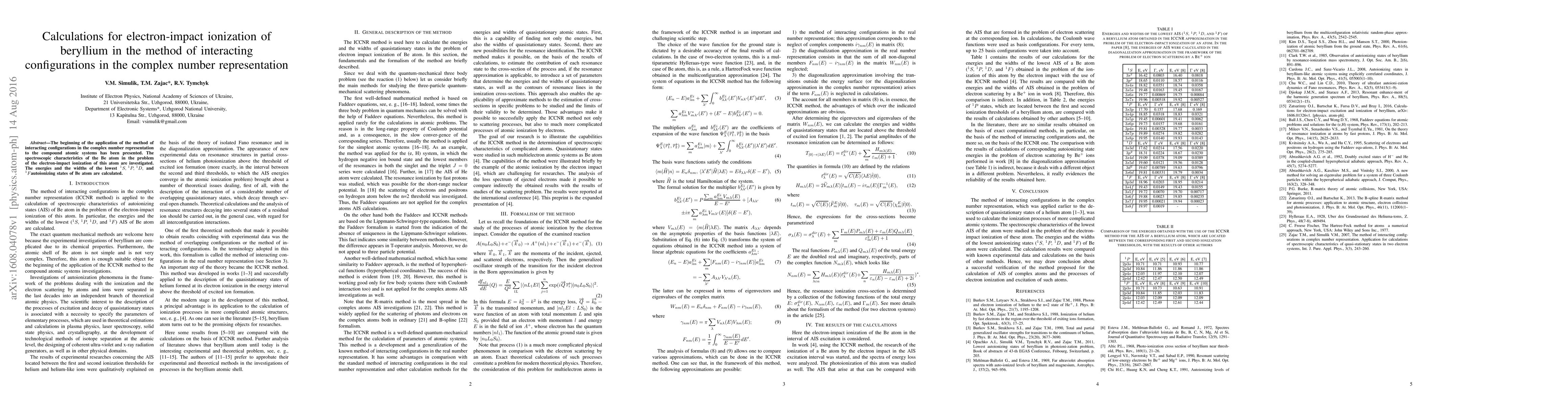 The beginning of the application of the method of interacting configurations in the complex number representation to the compound atomic systems has been presented. The spectroscopic characteristics of the Be atom in the problem of the electron-impact ionization of this atom are investigated. The energies and the widths of the lowest autoionizing states of Be atom are calculated.
