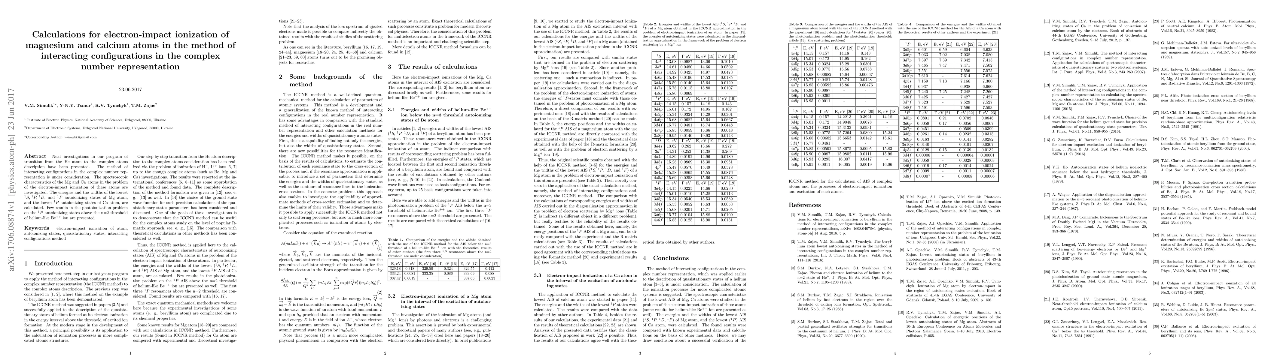 Next investigations in our program of transition from the He atom to the complex atoms description have been presented. The method of interacting configurations in the complex number representation is under consideration. The spectroscopic characteristics of the Mg and Ca atoms in the problem of the electron-impact ionization of these atoms are investigated. The energies and the widths of the lowest autoionizing states of Mg and Ca atoms are calculated. Few results in the photoionization problem on the autoionizing states above the n=2 threshold of helium-like Be ion are presented.