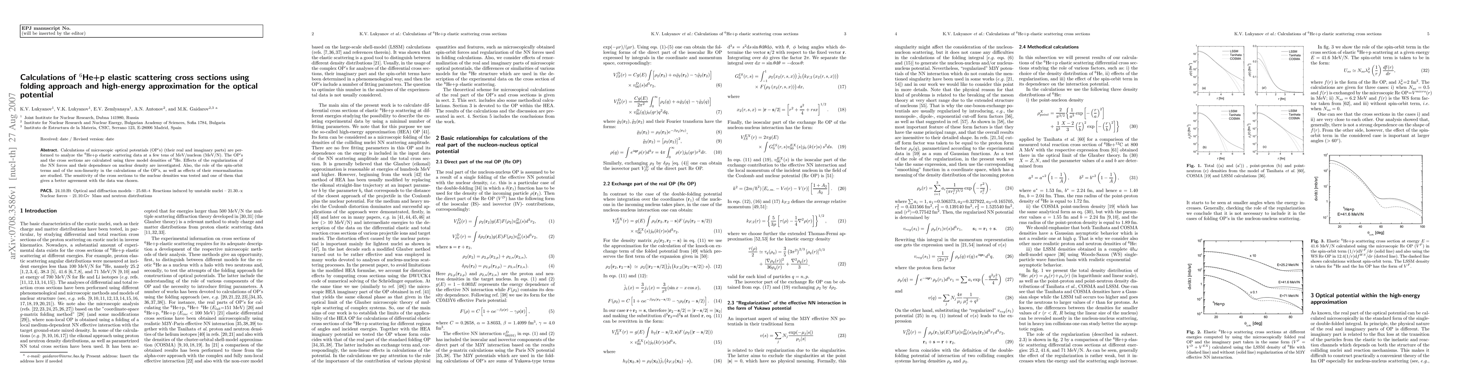 Calculations of microscopic optical potentials (OP's) (their real and imaginary parts) are performed to analyze the $^6$He+p elastic scattering data at a few tens of MeV/nucleon (MeV/N). The OP's and the cross sections are calculated using three model densities of $^6$He. Effects of the regularization of the NN forces and their dependence on nuclear density are investigated. Also, the role of the spin-orbit terms and of the non-linearity in the calculations of the OP's, as well as effects of their renormalization are studied. The sensitivity of the cross sections to the nuclear densities was tested and one of them that gives a better agreement with the data was chosen.