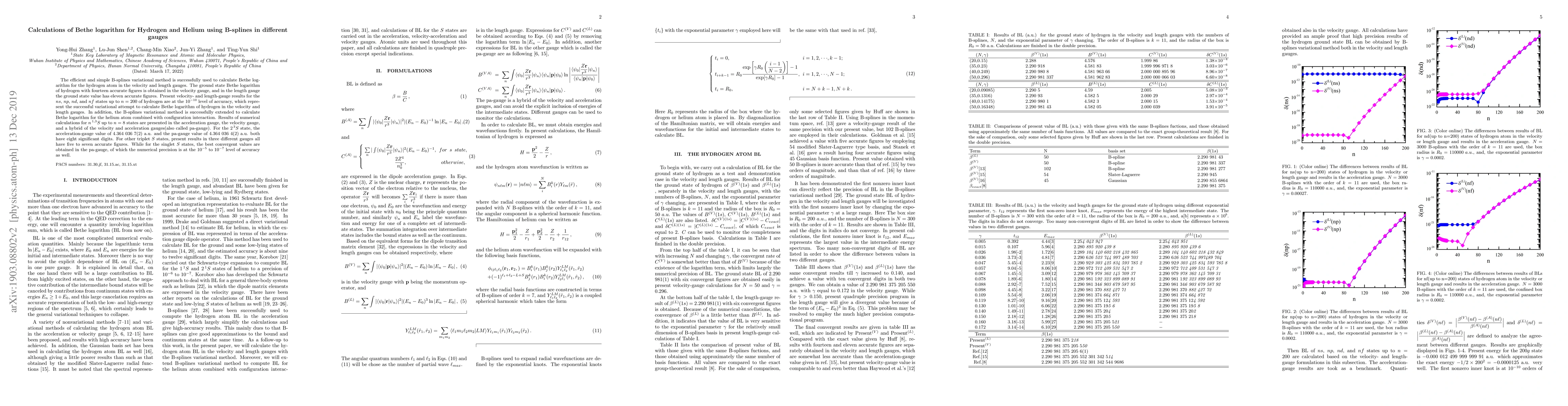This paper applies the B-splines variational method to calculate Bethe logarithms for hydrogen and helium atoms in various gauges, achieving high precision results for hydrogen states up to n=200 and helium states up to n=8. The method extends to velocity, length, and acceleration gauges, yielding accurate figures for both atoms.