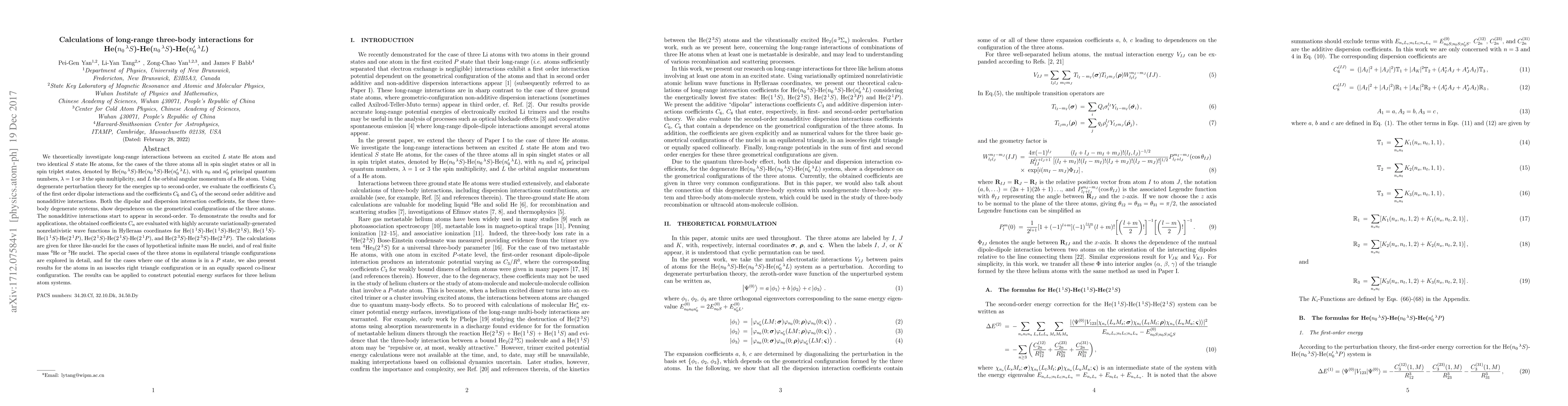 Researchers calculated long-range interactions between excited helium atoms and two identical ground-state helium atoms in various spin states, revealing dependences on geometrical configurations and the emergence of nonadditive interactions in second-order calculations.