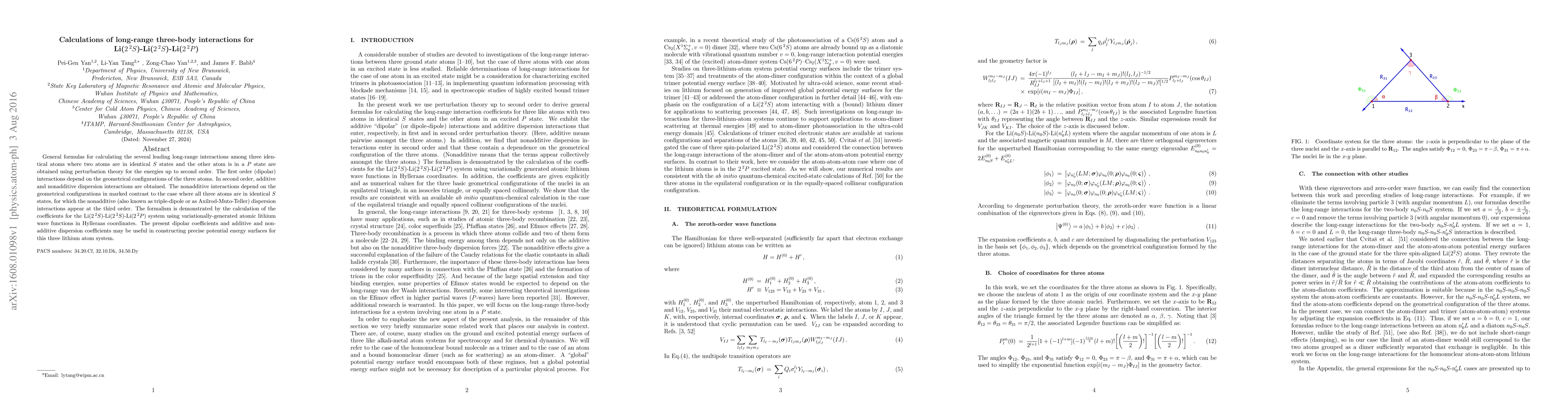 This paper derives general formulas for calculating long-range three-body interactions among lithium atoms in different electronic states using perturbation theory. It finds that nonadditive dispersion interactions depend on the geometrical configurations, contrasting with interactions among atoms all in $S$ states.