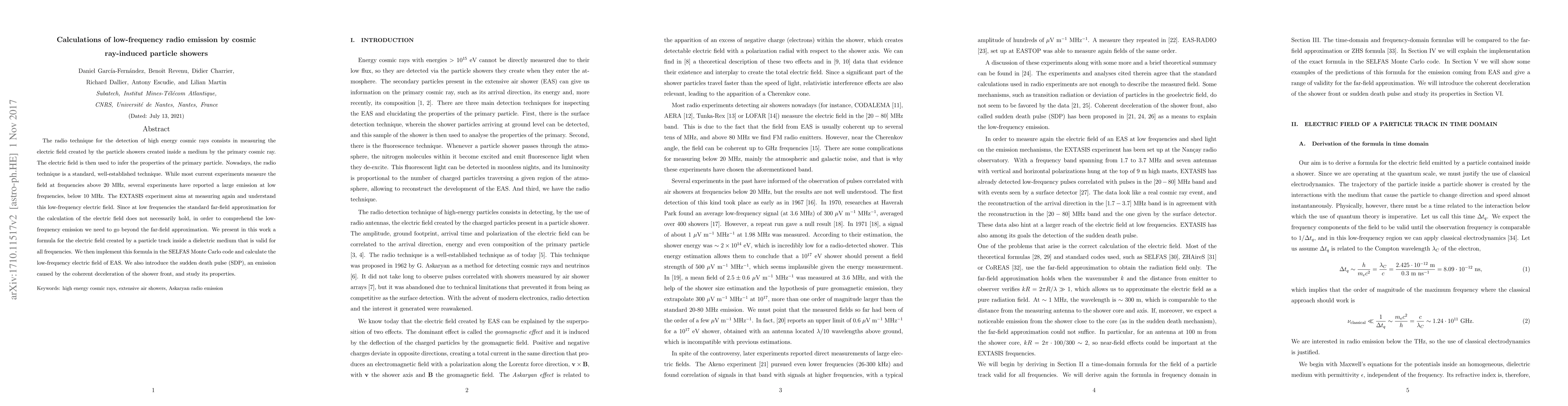 The radio technique for the detection of high energy cosmic rays consists in measuring the electric field created by the particle showers created inside a medium by the primary cosmic ray. The electric field is then used to infer the properties of the primary particle. Nowadays, the radio technique is a standard, well-established technique. While most current experiments measure the field at frequencies above $20$ MHz, several experiments have reported a large emission at low frequencies, below $10$ MHz. The EXTASIS experiment aims at measuring again and understand this low-frequency electric field. Since at low frequencies the standard far-field approximation for the calculation of the electric field does not necessarily hold, in order to comprehend the low-frequency emission we need to go beyond the far-field approximation. We present in this work a formula for the electric field created by a particle track inside a dielectric medium that is valid for all frequencies. We then implement this formula in the SELFAS Monte Carlo code and calculate the low-frequency electric field of EAS. We also introduce the sudden death pulse (SDP), an emission caused by the coherent deceleration of the shower front, and study its properties.